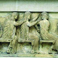 Η ζωφόρος της δυτικής πλευράς, δηλαδή της πρόσοψης, αποτελούνταν από τρεις πλάκες, από τις οποίες σώζονται οι δύο· σε καθεμία εικονίζεται ένα τέθριππο άρμα με αναβάτη μια θεά, που ανεβαίνει ή ξεπεζεύει. Με βεβαιότητα αναγνωρίζεται μόνο η πρώτη από τα βόρεια, η Αθηνά, που φοράει την αιγίδα και ίσως κράνος. Το άρμα της Αθηνάς το σέρνουν φτερωτά άλογα και μπροστά τους εικονίζεται ο Ερμής με κοντό χιτώνα, φτερωτά πέδιλα και το κηρύκειο στο χέρι. Πίσω από την Αθηνά διακρίνεται το περίγραμμα μιας ανδρικής μορφής, που θα μπορούσε να είναι ο Ηρακλής. Η ταυτότητα της δεύτερης θεάς είναι δύσκολο να προσδιοριστεί και έτσι το θέμα της ζωφόρου παραμένει αινιγματικό. Στη ζωφόρο της νότιας πλευράς, που σώζεται και αυτή αποσπασματικά, εικονιζόταν μια πομπή με άρματα και ιππείς και η απαγωγή δύο γυναικών. Η διπλή απαγωγή με άρματα οδηγεί στη σκέψη ότι το θέμα ήταν ίσως η αρπαγή των Λευκιππιδών (των κορών του Λευκίππου) από τους Διοσκούρους, τον Κάστορα και τον Πολυδεύκη.