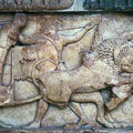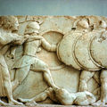 Στην ανατολική πλευρά η ζωφόρος σώζεται καλύτερα και το θέμα αναγνωρίζεται με τη βοήθεια των επιγραφών. Στα αριστερά εικονίζεται μια σύναξη θεών που κάθονται και συζητούν μεταξύ τους χειρονομώντας έντονα (εικ. 127). Το αντικείμενο της συζήτησης είναι η μάχη ανάμεσα σε δύο πολεμιστές, τον Αχιλλέα και τον Μέμνονα, που πλαισιώνονται από δύο συμμάχους τους και από τα άρματά τους. Ανάμεσα στους δύο μονομάχους κείτεται το σώμα του Αντίλοχου, του γιου του Νέστορα. Πρόκειται για ένα επεισόδιο του Τρωικού Πολέμου που το αφηγούνταν ένα χαμένο σήμερα επικό ποίημα, η Αιθιοπίς. Ο βασιλιάς των Αιθιόπων Μέμνων ήρθε να πολεμήσει στο πλευρό των Τρώων και σκότωσε τον Αντίλοχο, όταν αυτός προσπάθησε να υπερασπιστεί τον πατέρα του, τον Νέστορα. Τότε ο Αχιλλέας έτρεξε να εκδικηθεί τον φίλο του και βρέθηκε αντιμέτωπος με τον Μέμνονα. Η μονομαχία ήταν αμφίρροπη, γιατί ο Μέμνων ήταν γιος μιας θεάς, της Ηούς, όπως και ο Αχιλλέας ήταν γιος της Θέτιδας. Ξέρουμε ότι άλλοι θεοί υποστήριζαν τους Αχαιούς και άλλοι τους Τρώες. Τελικά τη λύση την έδωσε ο Δίας, που όρισε να ζυγιστούν οι ψυχές των δύο αντιπάλων. Ο δίσκος της ζυγαριάς με την ψυχή του Μέμνονα έγειρε προς τη γη και τον κάτω κόσμο, και έτσι νίκησε ο Αχιλλέας. Στο κέντρο της παράστασης διακρίνονται οι τρύπες για τη στερέωση των χάλκινων δίσκων της ζυγαριάς που κρατούσε ο Ερμής. Στη ζωφόρο της βόρειας πλευράς, που σώζεται καλύτερα από όλες, παριστάνεται η Γιγαντομαχία, δηλαδή η μάχη των θεών και των Γιγάντων, των γιων της Γης. Οι θεοί προχωρούν προς τα δεξιά, στην κατεύθυνση της νίκης, και πολεμούν ο καθένας με τα δικά του όπλα: στην ανατολική άκρη ο θεός-τεχνίτης Ήφαιστος, μπροστά στο φυσερό του, ετοιμάζεται να πετάξει πυρωμένους μύδρους, ενώ στη μέση της παράστασης η Θέμις (σημαντική θεά για τους Δελφούς, αφού κατείχε το μαντείο πριν από τον Απόλλωνα) οδηγεί τα λιοντάρια που σέρνουν το άρμα της εναντίον των Γιγάντων και αυτά τους κατασπαράζουν (εικ. 128). Οι Γίγαντες εικονίζονται ντυμένοι όπως οι οπλίτες (εικ. 129).