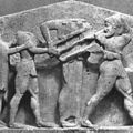 Στην Ακρόπολη της Αθήνας οι Πεισιστρατίδες αντικατέστησαν τα πώρινα γλυπτά των αετωμάτων του ναού της Αθηνάς, που είχε κατασκευαστεί, όπως είδαμε, στα τελευταία χρόνια του Πεισιστράτου, με μαρμάρινα. Στο ανατολικό αέτωμα διατηρήθηκε το θέμα των δύο λιονταριών, αποδόθηκε όμως με τρόπο διαφορετικό: ενώ στην παλαιότερη σύνθεση τα λιοντάρια σκοτώνουν από ένα μοσχάρι, εδώ καταβάλλουν μαζί έναν ταύρο. Επίσης στο νεότερο σύμπλεγμα τα θηρία δεν στρέφουν το κεφάλι με ανοιχτό το στόμα προς τον θεατή καθώς το θύμα τους κείτεται νικημένο στο έδαφος· αντίθετα, ο ταύρος αντιστέκεται ακόμα και προσπαθεί να ανασηκωθεί, ενώ τα δύο θηρία βυθίζουν τα νύχια και τα δόντια τους στις σάρκες του. Με αυτό τον τρόπο η παράσταση έχει χάσει τον συμβολικό και αποτροπαϊκό της χαρακτήρα και απεικονίζει πλέον με τρόπο ρεαλιστικό τον αγώνα για επιβίωση. Σημαντική είναι η μαρμάρινη σύνθεση του δυτικού αετώματος, η οποία σώζεται δυστυχώς πολύ αποσπασματικά και είναι δύσκολο να αποκατασταθεί στο σύνολό της. Βέβαιο είναι ότι εικονιζόταν ένας αγαπητός στους Αθηναίους μύθος, που είχε, όπως είδαμε, ιδιαίτερο συμβολισμό, η Γιγαντομαχία. Σώζονται αρκετά τμήματα από τη μορφή της Αθηνάς σε στάση επίθεσης, ώστε να είναι δυνατή η αποκατάστασή της, ενώ αξιοπρόσεκτος για το μοτίβο και τη συστροφή του σώματος είναι ένας Γίγαντας πεσμένος στο έδαφος (εικ. 134). Τα γλυπτά αυτά είναι αρκετά προχωρημένα από τεχνοτροπική άποψη και μπορούν να χρονολογηθούν στην προτελευταία δεκαετία του 6ου αιώνα (520-510 π.Χ.).