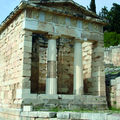Λίγο μεταγενέστερος είναι ο θησαυρός των Αθηναίων στους Δελφούς, που έχει και αυτός αξιόλογο γλυπτό διάκοσμο. Το οικοδόμημα είναι δωρικού ρυθμού (διαστάσεις 9,69 m x 6,62 m), δίστυλο εν παραστάσι, χτισμένο από παριανό μάρμαρο, και αναστηλώθηκε στα χρόνια 1903 ως 1906 με έξοδα του Δήμου Αθηναίων (εικ. 135). Οι τοίχοι του θησαυρού είναι γεμάτοι επιγραφές που χαράχθηκαν από τον 3ο αιώνα π.Χ. και έπειτα· ανάμεσά τους υπάρχουν και δύο ύμνοι στον Απόλλωνα γραμμένοι με μουσική σημειογραφία. Από τα αετωματικά γλυπτά σώζονται λίγα μόνο κομμάτια. Μεγάλη σημασία έχουν όμως οι τριάντα συνολικά ανάγλυφες μετόπες (από έξι στις στενές πλευρές και από εννέα στις μακρές), που σώθηκαν σχεδόν όλες, μερικές όμως σε κακή κατάσταση. Οι μετόπες της βόρειας και της δυτικής πλευράς παρίσταναν άθλους του Ηρακλή, ενώ οι μετόπες της νότιας πλευράς, τις οποίες οι επισκέπτες του ιερού έβλεπαν πρώτες καθώς ανηφόριζαν την ιερά οδό προς τον ναό του Απόλλωνα, έδειχναν τα κατορθώματα του Θησέα, του μυθικού βασιλιά που οι Αθηναίοι θεωρούσαν δημιουργό του κράτους τους και θεμελιωτή του δημοκρατικού τους πολιτεύματος. Ανάμεσα στους άθλους του Θησέα ξεχωριστή θέση είχαν οι μάχες του νεαρού ακόμη ήρωα με τους κακούργους (τον Σίνι, τον Σκίρωνα και τον Προκρούστη) που είχαν εγκατασταθεί σε διάφορα σημεία του δρόμου από την Τροιζήνα στην Αθήνα και κακοποιούσαν ή σκότωναν τους ταξιδιώτες. Στις έξι μετόπες της ανατολικής πλευράς (της εισόδου) εικονιζόταν ένα συλλογικό κατόρθωμα, η νίκη των Αθηναίων με αρχηγό τον Θησέα εναντίον των Αμαζόνων, που είχαν εκστρατεύσει εναντίον της πόλης τους.