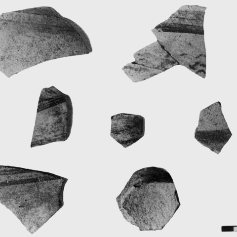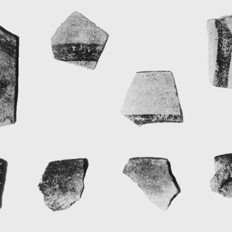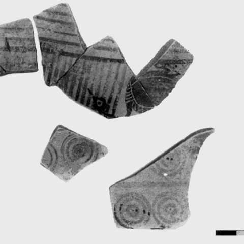 Εξάλλου, στα χαμηλότερα στρώματα ενός ιερού που εντοπίστηκε πλησίον της Τορώνης, μεταξύ του ακρωτηρίου και του Κωφού λιμένος (Πόρτο Κουφό) στη θέση Παρθενώνας, στην κορυφή «Κώστας» του Ίταμου (Eικ. 30, 31), βρέθηκαν ανάμεσα σε άλλα όστρακα κεραμικής από λεπτά μονόχρωμα κύπελλα με ταινιωτή λαβή και όστρακα με γραπτή γραμμική διακόσμηση[44] (Eικ. 32, 33). Τα πρώτα όστρακα χρονολογούνται ανάμεσα στα τέλη του 7ου και τις αρχές του 6ου αι. π.Χ., ενώ τα δεύτερα στον 6ο αιώνα. Το σύνολο αυτό αποδίδεται σε ευβοϊκά εργαστήρια.
