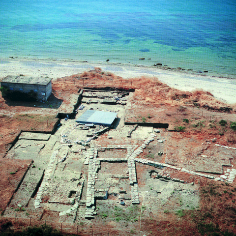 Το κτίριο ΣΤ (Εικ. 7) είναι μια μακρόστενη μονόχωρη κατασκευή, με κατεύθυνση βόρεια-νότια, μήκους 14,27 μ. και πλάτους 5,42 μ. Η βόρεια πλευρά του σχηματίζει αψίδα, ενώ η νότια είναι ανοικτή προς τη θάλασσα. Την υποθεμελίωση των τοίχων αποτελούσαν μεγάλες κροκάλες και βότσαλα, την ευθυντηρία σειρές από λιγότερο ή περισσότερο κατεργασμένες πέτρες, ενώ η ανωδομή ήταν πιθανότατα κατασκευασμένη από άψητα πλιθιά και ενισχυμένη με ξύλινους πασσάλους τοποθετημένους σε επαφή με τους τοίχους. Το δάπεδο του κτιρίου ήταν από πατημένο κιτρινωπό πηλό. Οι δύο μακριές πλευρές κατέληγαν σε όρθια τοποθετημένες πλάκες, εσωτερικά των οποίων σχηματίζονταν υποδοχές για πασσάλους. Δύο μεγάλες κυκλικές κατασκευές από πηλό, στον διαμήκη άξονα του κτιρίου και πάνω στο δάπεδο, χρησίμευαν πιθανότατα και αυτές για τη στήριξη της στέγης. Σύμφωνα με τα δεδομένα της ανασκαφικής έρευνας το κτίριο κατασκευάσθηκε στα τέλη του 11ου ή στις αρχές του 10ου αι. π.Χ., αλλά σταμάτησε να λειτουργεί ένα αιώνα αργότερα. Η διακοπή αυτή, η οποία διήρκεσε σε ολόκληρο τον 9ο αι. π.Χ., και η οποία αποδεικνύεται από ένα παχύ στρώμα καθαρής αιολικά φερτής άμμου που σκεπάζει το πρωτογεωμετρικό λιθόστρωτο εξωτερικά του κτιρίου, πρέπει να συνέβη ενώ το αψιδωτό κτίριο έσωζε ακόμη την ανωδομή του. Είναι ωστόσο βέβαιο ότι η ανωδομή δεν υπήρχε πλέον στη διάρκεια του 7ου αι., καθώς το στρώμα των θυσιών ακουμπά πάνω στο θεμέλιο του τοίχου.