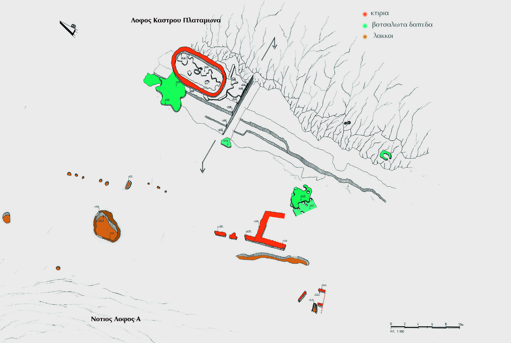 Όπως συμβαίνει στο Αιγαίο αυτή την εποχή, η εγκατάσταση βρισκόταν σε ακρωτήριο, στον λόφο δηλαδή του κάστρου του Πλαταμώνα.[172] Η λέξη «πλαταμών» σηματοδοτεί μία λεία «πέτρα» (λείο βράχο) που περιβάλλεται ή καλύπτεται με νερό, όπως και του λόφου του Κάστρου Πλαταμώνα. Ο βυζαντινός Πλαταμών λοιπόν δεν θα μπορούσε παρά να είναι και ένας αρχαίος πλαταμών. Το Ηράκλειο θα μπορούσε να εκτείνεται και πέραν του συγκεκριμένου λόφου, οπότε ο λόφος του Κάστρου θα ήταν ο πλαταμώνας του.[173]