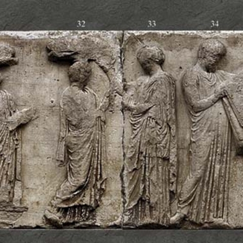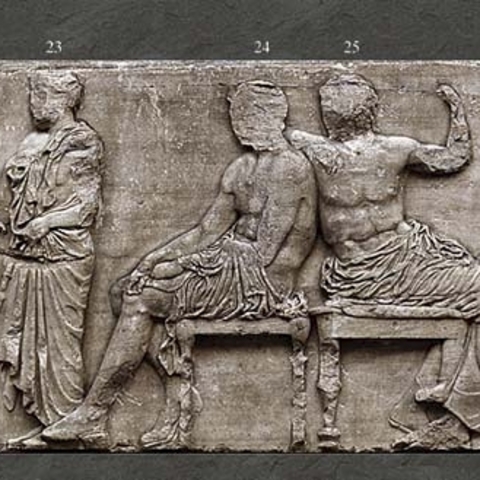 Στη ζωφόρο του Παρθενώνα οι θεοί εμφανίζονται σε ομάδες, κάτι που αποσαφηνίζει και την ταυτότητά τους. Όλοι είναι καθισμένοι σε δίφρους εκτός από τον Δία, που είναι ένθρονος, και την Ίριδα, την θεά που μεταφέρει τα μηνύματα, που στέκεται όρθια. Οι πρώτοι που παρακολουθούν την προσέλευση της πομπής των Παναθηναίων είναι τα αδέλφια Ερμής και Διόνυσος που γέρνει νωχελικά στη ράχη του αδελφού του· δίπλα η μητροπρεπής Δήμητρα στηρίζει το πηγούνι στο υψωμένο χέρι της· ακολουθεί ο νευρικός Άρης. (Εικ. 28) Ακολουθεί η όρθια Ίρις που τακτοποιεί τα μαλλιά της και μετά το ζεύγος Δίας - Ήρα. (Εικ. 29). Η Ήρα, σε μια χαρακτηριστική κίνηση ανάμεσα στα ζευγάρια, αποκαλύπτει στον ένθρονο Δία το πρόσωπό της σηκώνοντας το πέπλο της. Ακολουθεί η σκηνή με την παράδοση του πέπλου, ενώ δίπλα άλλοι επτά θεοί (σύνολο δεκατέσσερις) παρακολουθούν την προσέλευση του βορινού σκέλους της πομπής των Παναθηναίων. Η πρώτη θέση έχει δοθεί αυτονόητα στην τιμώμενη θεά Αθηνά, την οποία συντροφεύει ο Ήφαιστος· Ποσειδών και Απόλλων δημιουργούν αντίθεση, καθώς ο μεγαλύτερος και γενειοφόρος θεός είναι δίπλα στον ιδιαιτέρως νεανικό θεό της δεύτερης γενιάς Απόλλωνα· Άρτεμις και Αφροδίτη συναποτελούν ενότητα, μαζί με τον Έρωτα που, γερμένος στα πόδια της θεάς, την προστατεύει από τον ήλιο με σκιάδιο. (Εικ. 30) Δήμητρα και Αφροδίτη είναι οι μόνες από τους θεούς που έχουν συνοδευτικά χαρακτηριστικά, δαυλό και τον Έρωτα αντίστοιχα.