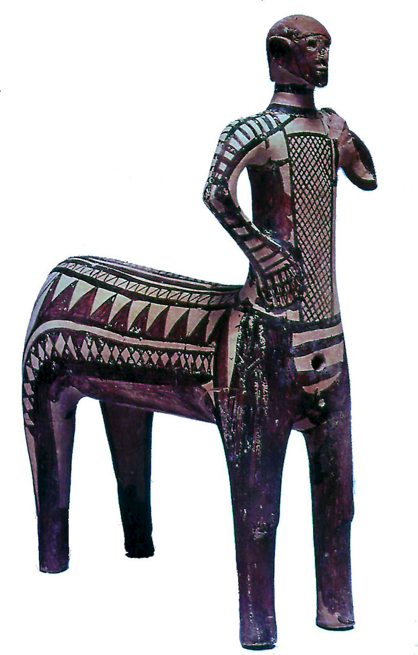Πήλινο αγαλμάτιο Κενταύρου του 10ου αι. π.Χ. που βρέθηκε σε έναν τάφο στο Λευκαντί της Εύβοιας. Τα πήλινα αγαλμάτια είναι τα απλούστερα από κατασκευαστική άποψη έργα και τα συναντούμε ήδη από τον 10ο αι. π.Χ. κυρίως ως αναθήματα σε ιερά. Τα περισσότερα από αυτά είναι πολύ απλές και άτεχνες μορφές, πλασμένες ελεύθερα με το χέρι χωρίς τη χρήση μήτρας. Υπάρχουν όμως και πιο περίτεχνα πήλινα έργα, ένα από τα οποία αποτελεί και το εντυπωσιακό συγκεκριμένο αγαλμάτιο.