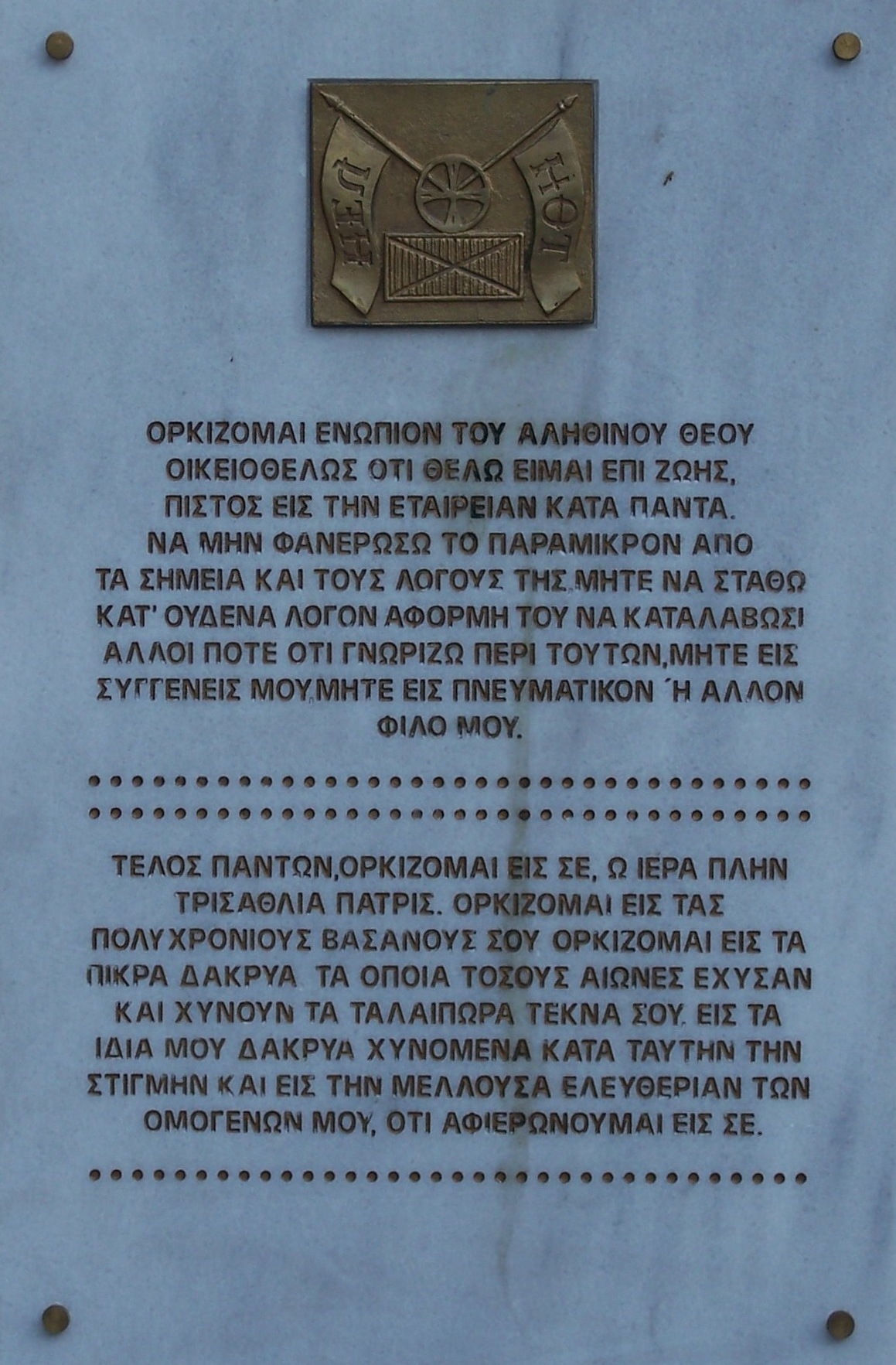 Τα παιδιά σπρώξανε το ένα το άλλο, και κοιτάχτηκαν. Πρώτη φορά τους τύχαινε κάτι τέτοιο! Κάτω στην τραπεζαρία, όλοι σηκωθήκανε. Ο Γαλάτης φαινόντανε συγκινημένος. Ακούμπησε το χέρι του στο Ευαγγέλιο, κι ο Σκουφάς, με βαθιά κι επίσημη φωνή άρχισε να λέει τον όρκο, τον φοβερό όρκο της Φιλικής Εταιρείας. Ο Γαλάτης τον ξανάλεγε, και τα παιδιά, με χαρτί και μολύβι, γράφανε σα τρελά, μη χάσουν λέξη. «Ενώπιον του αοράτου και αληθινού Θεού… ορκίζομαι ότι θα είμαι πιστός εις την Εταιρείαν των Φιλικών… δεν θα φανερώσω τα σημεία εις κανέναν άνθρωπον… θα είμαι τίμιος και ενάρετος… θα βοηθώ τον δυστυχή και αδύνατον, θα αγαπώ εξ όλης της ψυχής την πατρίδα μου, θα καταφρονώ τη ζωή μου για να κάνω το καλό, θ’ αποκριθώ την αλήθεια στον κατηχητή μου… θα μισήσω τους τυράννους…» Ο όρκος τέλειωσε.