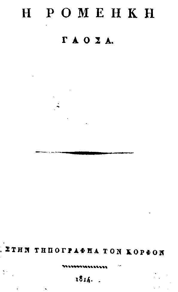 Στο βιβλιαράκι του, που τυπώθηκε στην Κέρκυρα το 1814, συνοψίζει τη γραμματική του εκδοχή σε μια «Μηκρη ορμηνια για τα γραματα, κε ορθογραφηα της ρομεηκης γλοσας» που καλύπτει λιγότερες από τρεις σελίδες. Ασύγκριτα μεγαλύτερο ενδιαφέρον παρουσιάζει το σημείωμά του «Προς τους αναγνοστες» όπου παραβολικά και σε έντονα προσωπικό τόνο μορφοποιεί τις γλωσσικές και τις ευρύτερα ιδεολογικές του απόψεις: […] ενώ τα ποιήματα και οι μεταφράσεις που συνεκδίδει αποσκοπούν