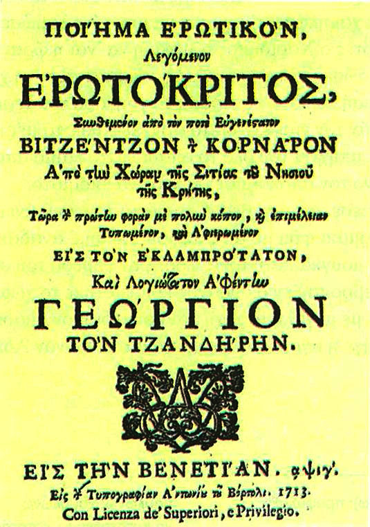 […] Ο Ερωτόκριτος ωριμάζει μέσα στις ίδιες συνθήκες που εκδηλώθηκαν όταν εμφανίστηκαν ο Χορτάτσης και οι άλλοι δραματουργοί· ανήκει σε είδος διαφορετικό, αφού είναι ποίημα αφηγηματικό, αλλά μοιράζεται με το θέατρο τις ίδιες πολιτισμικές και αισθητικές αντιλήψεις.