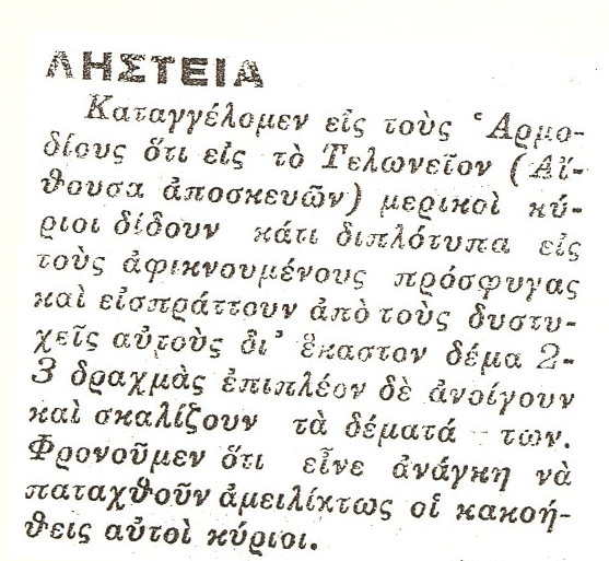 Στην πρώτη συνάθροιση με τις κεφαλές των προσφύγων υποσχέθηκε να βοηθήσει. Έβαλε την ουρά στα σκέλια και τράβηξε στη Σαλονίκη. Ανέβηκε στα γραφεία του κόμματος των Φιλελευθέρων και έψαξε για γνωστούς. Οι παλιοί του συνάδελφοι, πιο καλοντυμένοι πια, με καλοψαλιδισμένα μουστάκια και κολάρο που μύριζε λεβάντα, τρόμαξαν να τον αναγνωρίσουν. Έκαναν πως χάρηκαν, η απορία τους όμως ήταν ζωγραφισμένη στο πρόσωπό τους.