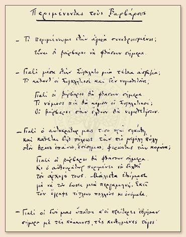 κι αποχαιρέτα την, την Aλεξάνδρεια που χάνεις.Κ. Π. Καβάφης, «Απολείπειν ο θεός Αντώνιον», Ποιήματα, Ίκαρος 1984, τ. 1, σ. 20.