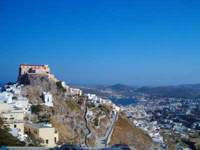 Η Σύρος, από τη θάλασσα, είναι σα μια εξαίσια ακουαρέλα. Δυο ψηλοί κωνικοί λόφοι, σκεπασμένοι από τη ρίζα τους ως την κορφή τους με άσπρα, ρόδινα και γαλάζια σπίτια, καθρεφτίζονται πάνω στα γαλήνια νερά.
