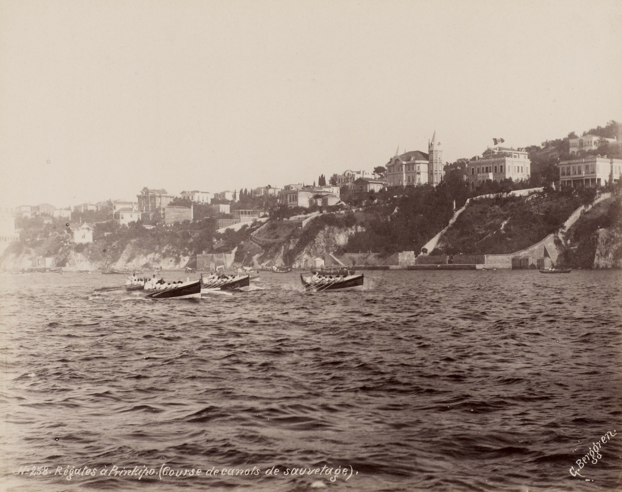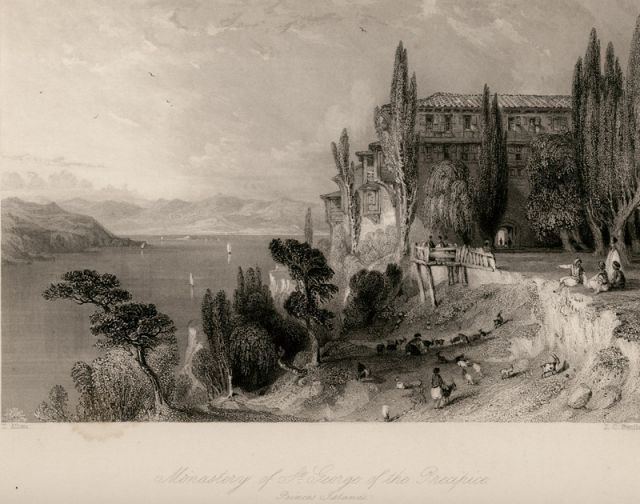Η ακτή της Πριγκίπου προβάλλει, όπως έρχεται κάνεις από την Κωνσταντινούπολη, με τη μορφή μιας ψηλής όχθης με κοκκινωπά κατσάβραχα, πάνω στην οποία δεσπόζει μια σειρά σπιτιών· ξύλινες κλίμακες ή απότομα μονοπάτια, που διαγράφουν οξείες γωνίες, κατηφορίζουν από τον γκρεμό στη θάλασσα, που πλαισιώνεται από ξύλινες καμπίνες για τους λουόμενους. Μια εκπυρσοκρότηση αναγγέλλει ότι το ατμόπλοιο είναι ενόψει, και αμέσως ένας στόλος από καΐκια και λέμβους ξεκολλάει από την ξηρά για να προϋπαντήσει τους επιβάτες, γιατί η ρηχότητα των νερών δεν επιτρέπει στα πλεούμενα με μεγάλη καρίνα να πλησιάσουν.
