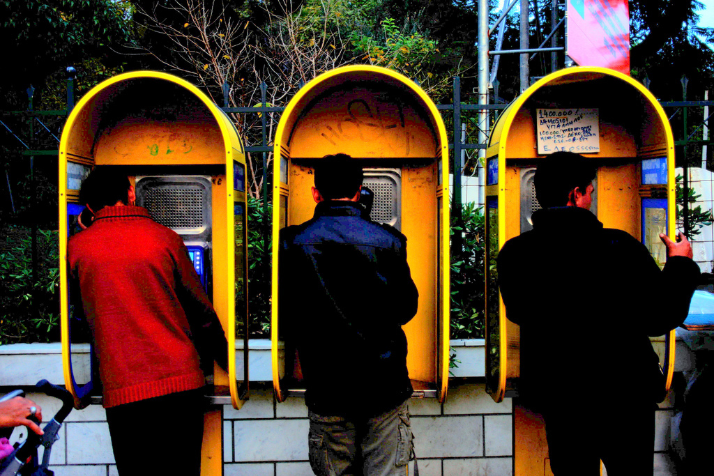 Γωνία Αγίας Φωτεινής κι Ελευθερίου Βενιζέλου στη Νέα Σμύρνη. κανείς δεν τον βλέπει καθώς έχει χωμένο το κεφάλι του μέσα στο τηλεφωνικό κουβούκλιο. Μονάχα τα πόδια του πατάνε γερά στο γυρτό πεζοδρόμιο, που, καθώς χαμηλώνει για τη διάβαση των πεζών, γίνεται κι αυτό ξαφνικά αδιάβατο από ένα παρκαρισμένο αυτοκίνητο. Το ένα πόδι λυγίζει πάνω στο άλλο για να ξεκουραστεί, το κεφάλι του να μη βλέπει προς τα έξω, να έχει την ψευδαίσθηση ότι βρίσκεται κάπου απομονωμένος.