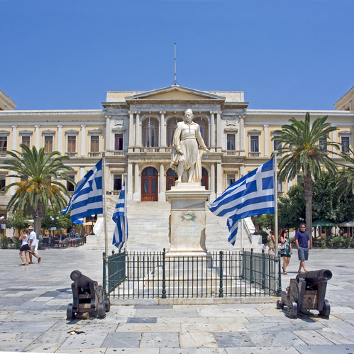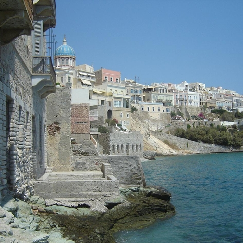 Στο ιστορικό κέντρο της Ερμούπολης δεσπόζει η πλατεία Μιαούλη με το επιβλητικό νεοκλασικό Δημαρχείο, δεξιά του οποίου βρίσκεται η μαρμάρινη Λέσχη Ελλάς, που φιλοξενεί στον πρώτο όροφο το Πνευματικό Κέντρο Ερμούπολης. Πίσω από το Δημαρχείο ορθώνεται το ιστορικό πρώτο Γυμνάσιο της Ελλάδας και πιο πάνω απλώνεται, χτισμένη δίπλα στη θάλασσα, η αριστοκρατική συνοικία «Τα βαπόρια» με τα υπέροχα νεοκλασικά μέγαρα και τη μαγευτική θέα. Πολύ κοντά στην πλατεία Μιαούλη, βρίσκεται και το δημοτικό Θέατρο Απόλλων, η αρχιτεκτονική του οποίου είναι βασισμένη σε ιταλικά πρότυπα.