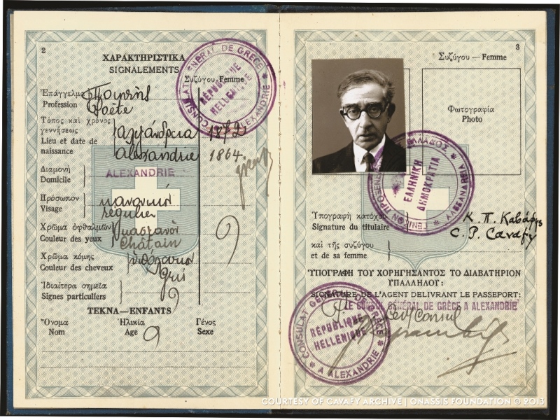 Το διαβατήριο του Κ. Π. Καβάφη (με λάθος χρονολογίες γέννησης). Ευγενική παραχώρηση του Ιδρύματος Ωνάση από το Αρχείο Καβάφη. Το περιεχόμενο αποτελεί ιδιοκτησία του Ιδρύματος Ωνάση και προστατεύεται από το νόμο. Ο Καβάφης υπήρξε ένας Βρετανός υπήκοος, με ελληνικό διαβατήριο, στην αποικιοκρατούμενη Αίγυπτο.