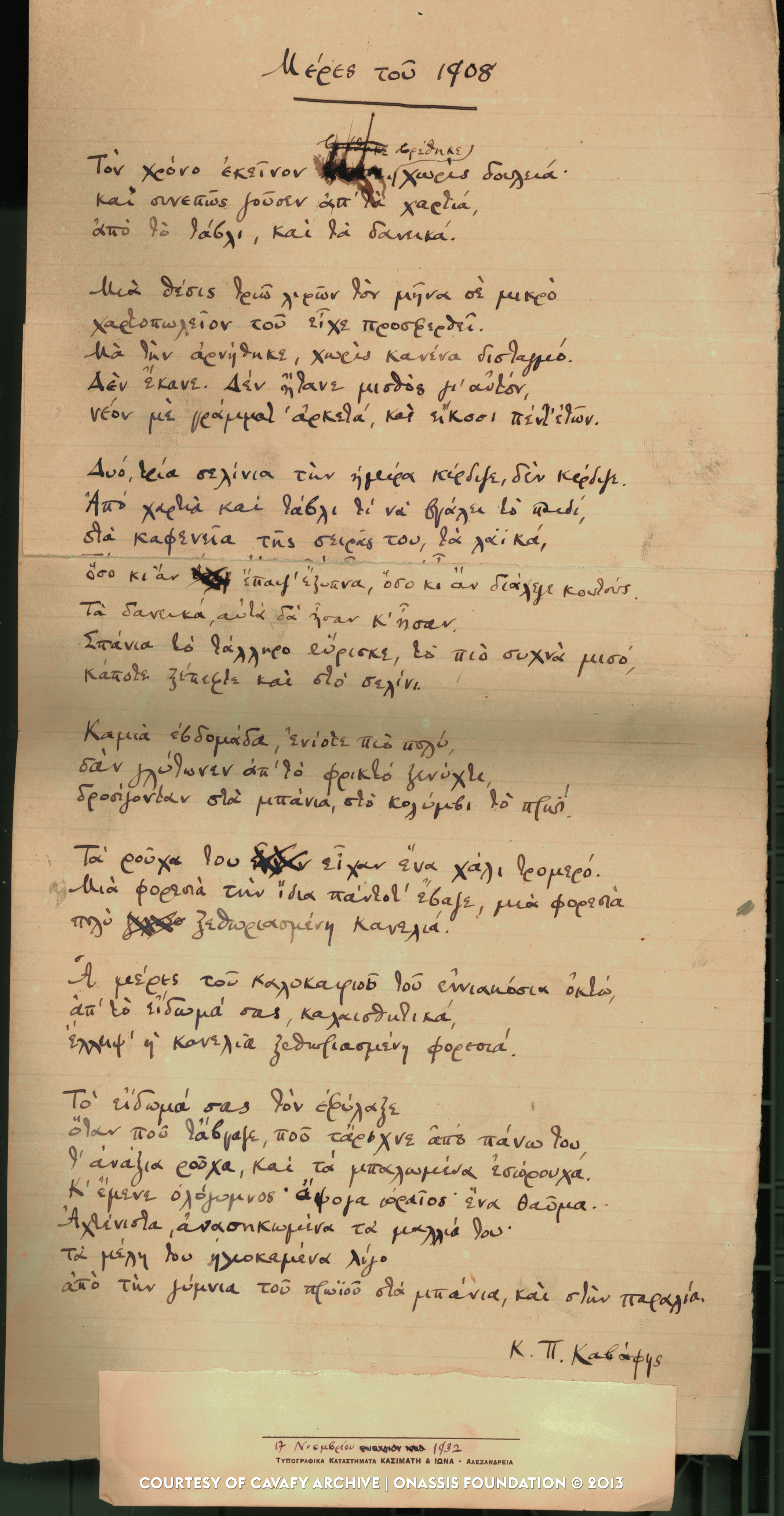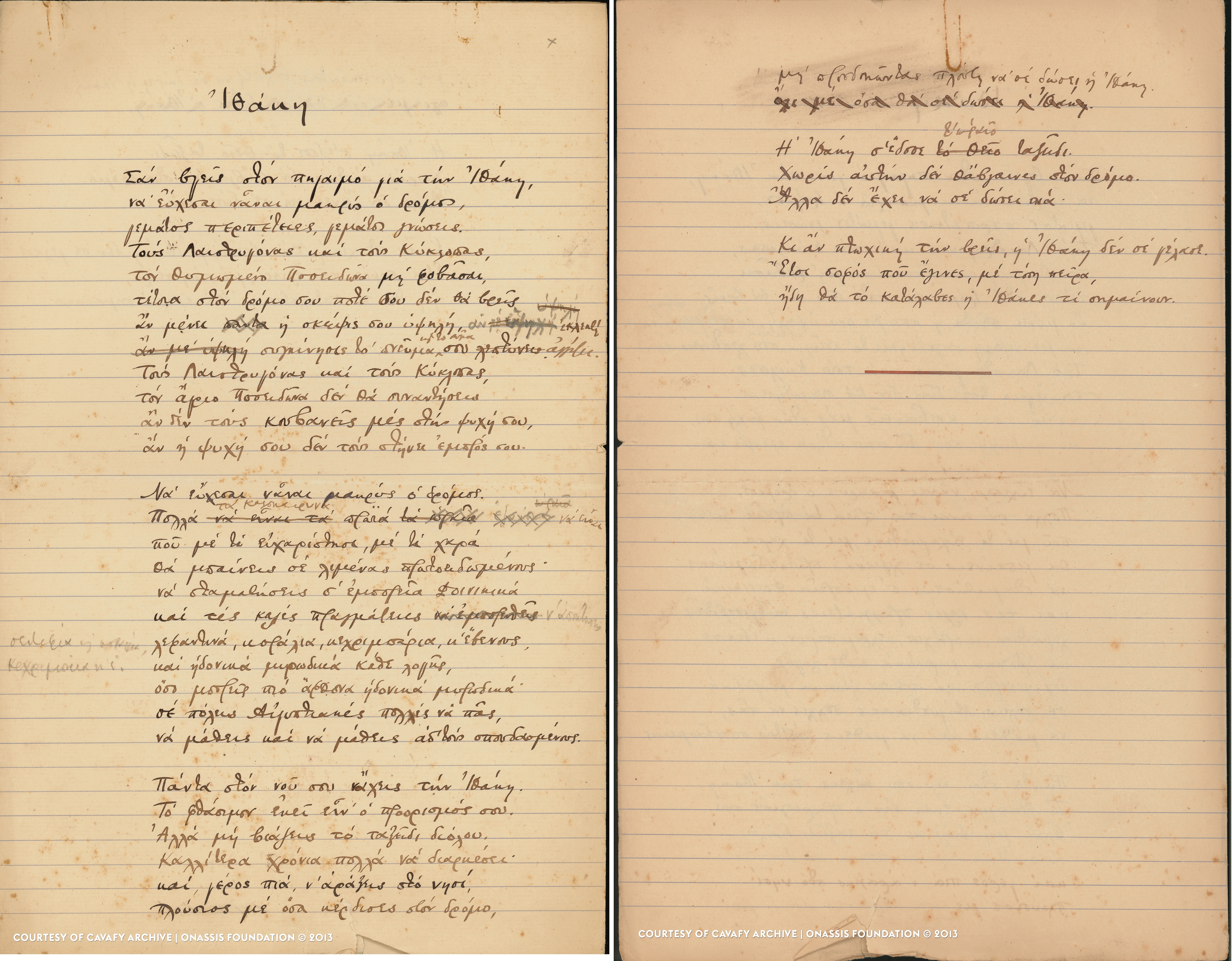 Χειρόγραφο του ποιήματος. Ευγενική παραχώρηση του Ιδρύματος Ωνάση από το Αρχείο Καβάφη. Το περιεχόμενο αποτελεί ιδιοκτησία του Ιδρύματος Ωνάση και προστατεύεται από το νόμο.