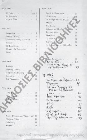 Ο πίνακας περιεχομένων σε αντίτυπο χρονολογικής καβαφικής συλλογής που απόκειται στη Δημόσια Ιστορική Βιβλιοθήκη της Ζαγοράς, με αυτόγραφη συμπλήρωση. Πρόκειται για τη συλλογή Ποιήματα 1910 -, που κυκλοφορούσε από το 1912 ώς το 1918· το συγκεκριμένο σώμα φαίνεται συμπληρωμένο με ποιήματα και του 1917. Γίνεται έτσι φανερό ότι κάθε χρονολογική συλλογή περνάει από πολλά στάδια εξέλιξης μέχρι να αντικατασταθεί. Το 1917 ο Καβάφης θα κυκλοφορήσει και την πρώτη του θεματική συλλογή (Ποιήματα 1909-1911) ―η χρονολογία του τίτλου αναφέρεται στο χρονολογικό εύρος των ποιημάτων που περιλαμβάνει η συλλογή, όχι όμως και στην κατάταξή τους. Πηγή: Ψηφιακή Βιβλιοθήκη Δημόσιων Βιβλιοθηκών.