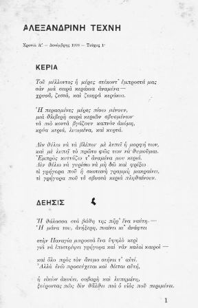 Το περιοδικό «Αλεξανδρινή Τέχνη» (1926-1931) συστήνεται στο κοινό με το πρώτο τεύχος του με την αναδημοσίευση ποιημάτων παλαιότερης περιόδου του Καβάφη στις πρώτες σελίδες, αλλά και μια επίθεση στον Κωστή Παλαμά στις επόμενες, με αφορμή συνέντευξη του Παλαμά στην οποία χαρακτήρισε τα ποιήματα του Καβάφη ως «ρεπορτάζ από τους αιώνες». Πηγή: Ψηφιακή Συλλογή Κοσμόπολις
