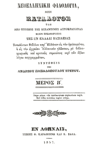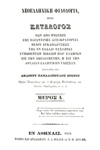 Νεοελληνική Φιλολογία, ήτοι κατάλογος των από πτώσεως της βυζαντινής αυτοκρατορίας μέχρι εγκαθιδρύσεως της εν Ελλάδι βασιλείας τυπωθέντων βιβλίων. Βιογραφία των εν τοις γράμμασι διαλαμψάντων Ελλήνων, 1854