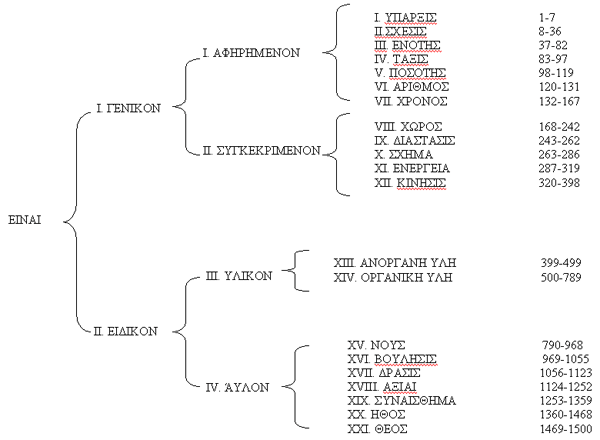 Ως προς την οργάνωση της ύλης του πρώτους μέρους θα πρέπει να αναφέρουμε πως αυτή είναι διαρθρωμένη με λογικά κριτήρια και, σύμφωνα με όσα παρατίθενται στο λεξικό, ακολουθεί την οργάνωση του ΕΙΝΑΙ το οποίο διακρίνεται σε Γενικό και Ειδικό. Το καθένα από αυτά τα δύο μέρη υποδιαιρείται σε επιμέρους ενότητες. Το Γενικό υποδιαιρείται σε Αφηρημένο και Συγκεκριμένο, ενώ το Ειδικό σε Υλικό και Άυλο. Επιπλέον, το καθένα από αυτά διακρίνεται σε κάποια μέρη. Έτσι, λοιπόν, διακρίνουμε στο Αφηρημένο τα μέρη Ύπαρξη, Σχέση, Ενότητα, Τάξη, Ποσότητα, Αριθμός, Χρόνος, ενώ στο Συγκεκριμένο διακρίνουμε τα μέρη Χώρος, Διάσταση, Σχήμα, Ενέργεια, Κίνηση. Στο Υλικό βρίσκουμε τα μέρη Ανόργανη και Οργανική Ύλη και στο Άυλο τα μέρη Νους, Βούληση, Δράση, Αξία, Συναίσθημα, Ήθος, Θεός. Το παρακάτω σχήμα, το οποίο παρατίθεται και στο Αντιλεξικόν, απεικονίζει παραστατικά την παραπάνω διαίρεση.