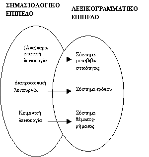 Αυτό που πρέπει να σημειωθεί είναι ότι αυτές οι λειτουργίες πραγματώνονται μέσω συγκεκριμένων επιλογών στο λεξικογραμματικό σύστημα της γλώσσας. Η (ανα)παραστατική λειτουργία πραγματώνεται μέσω του συστήματος μεταβιβαστικότητας [transitivity], το οποίο περιλαμβάνει τις διαδικασίες (τα ρήματα), τους/τις μετέχοντες/-ουσες (τα ουσιαστικά) και τα καταστασιακά στοιχεία (προθετικές φράσεις χρόνου, τόπου, τρόπου κτλ). Η διαπροσωπική λειτουργία πραγματώνεται μέσω του συστήματος του τρόπου [mood], το οποίο αναφέρεται στο βαθμό βεβαιότητας ή σιγουριάς (σύστημα τροπικότητας [modality]) που εκφράζεται από την πρόταση, στο είδος των προτάσεων (δήλωση, ερώτηση), στους δείκτες ευγένειας κτλ. Μέσω, δηλαδή, αυτού του συστήματος της πρότασης εκφράζεται ο ρόλος που ο/η ομιλητής/-τρια έχει επιλέξει να υιοθετήσει σε μια επικοινωνιακή περίσταση καθώς επίσης και ο ρόλος ή οι πιθανοί ρόλοι που έχει επιλέξει να εκχωρήσει στους/στις συνομιλητές/-τριές του. Τέλος, η κειμενική λειτουργία πραγματώνεται μέσω του συστήματος του θέματος-ρήματος [theme-rheme], το οποίο περιλαμβάνει διάφορα μοτίβα οργάνωσης της πρότασης. Η σχέση μεταξύ σημασιολογικού και λεξικογραμματικού επιπέδου απεικονίζεται στο Σχήμα 2 και διερευνάται αναλυτικότερα, μέσα από ενδεικτικά παραδείγματα, στις σελίδες που ακολουθούν.