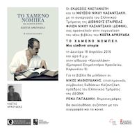 Το Μουσείο Καζαντζάκη και οι Εκδόσεις Καστανιώτη σάς προσκαλούν στην παρουσίαση του βιβλίου «Το χαμένο Νόμπελ, μια αληθινή ιστορία» του Κώστα Αρκουδέα. Η παρουσίαση θα πραγματοποιηθεί σε συνεργασία με το Ελληνικό Τμήμα της Διεθνούς Εταιρείας Φίλων Νίκου Καζαντζάκη (ΔΕΦΝΚ) τη Δευτέρα 18 Απριλίου 2016 στις 8.00 μ.μ. στην αίθουσα «Καστελλάκη» (Εμπορικό Επιμελητήριο Ηρακλείου, Κορωναίου 9).