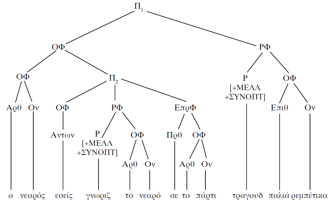 – Bασική δομή του λόγου είναι η πρόταση. Oι προτάσεις αναλύονται σε φράσεις (ονοματική φράση, ρηματική φράση…).