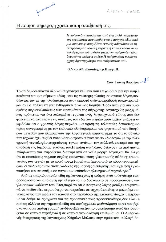 Αλέξης Ζήρας, Η ποίηση σήμερα, η χρεία και η απαξίωσή της