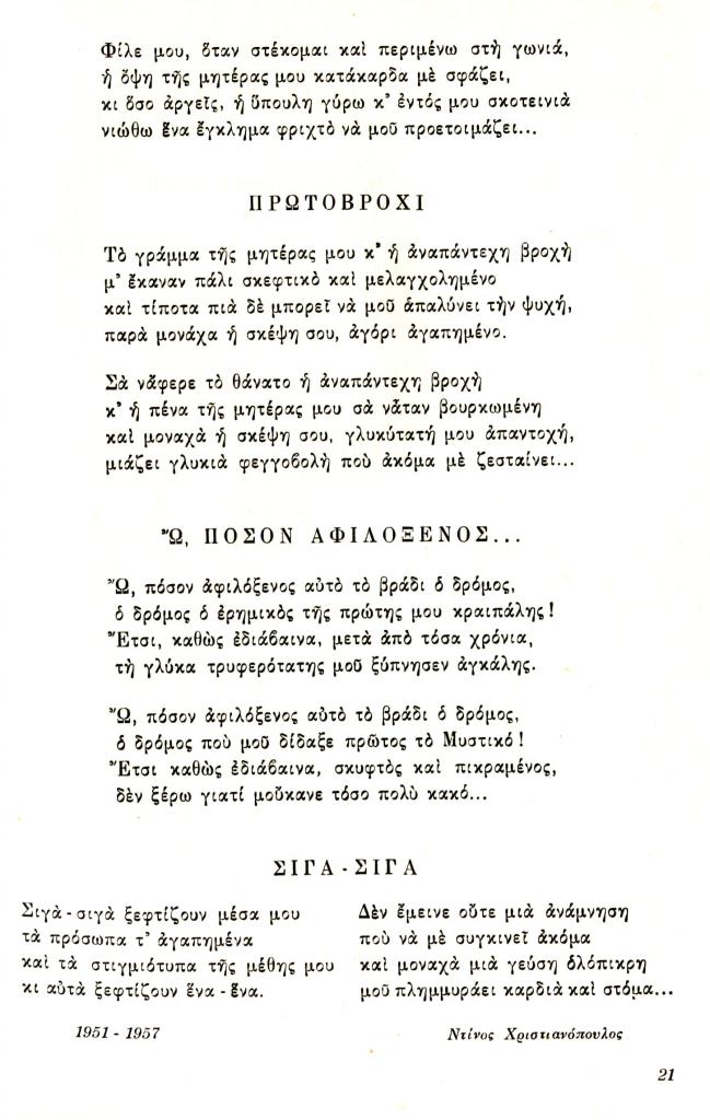 , «Οκτώ ποιήματα στη μνήμη του Ναπολέοντα Λαπαθιώτη. Φίλε μου, σε περίμενα», Διαγώνιος, τχ. 1 (Ιανουάριος-Ιούνιος 1959), σ. 20-21