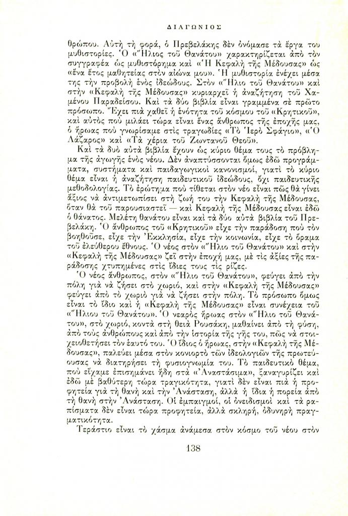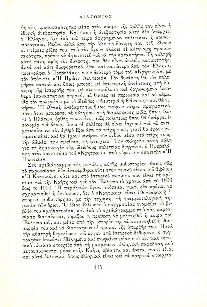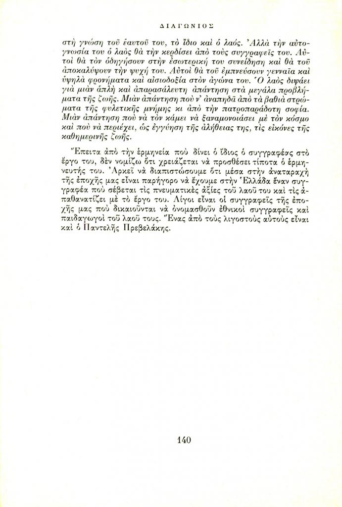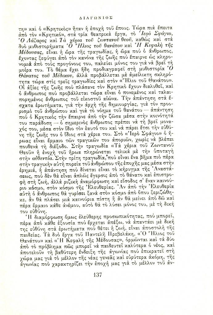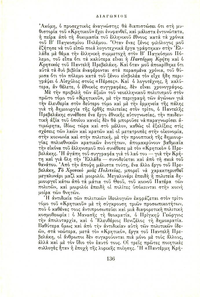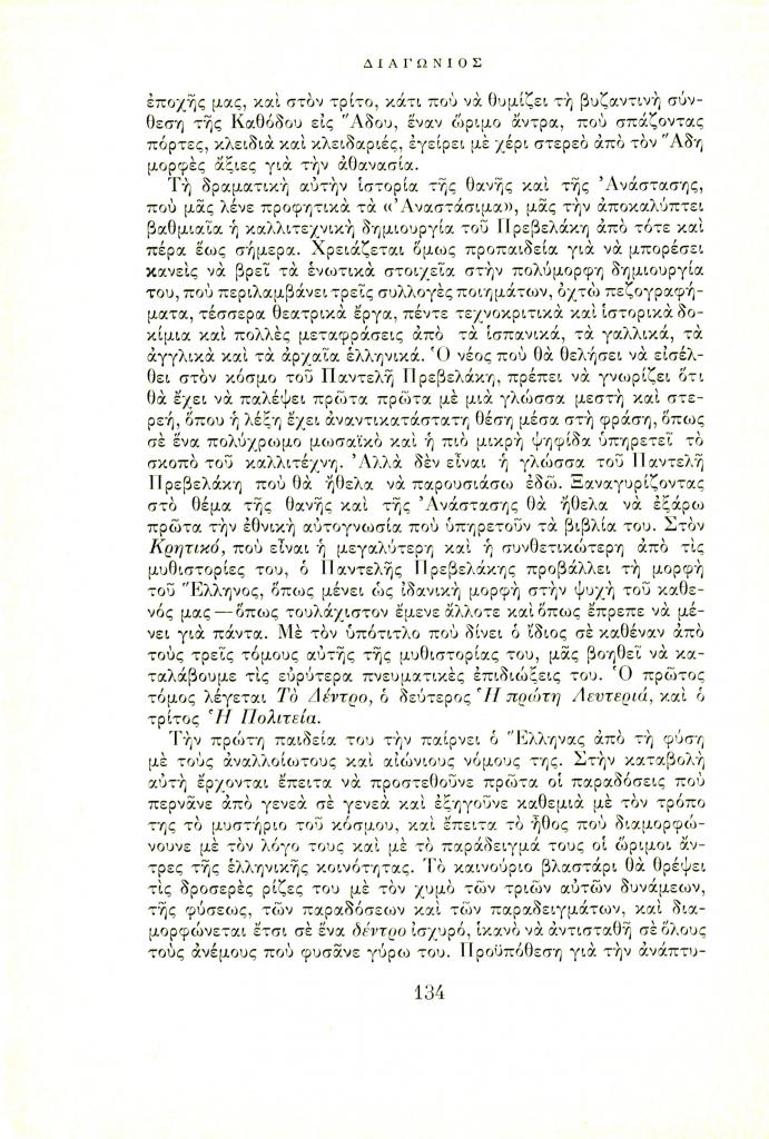 Λαούρδας Βασίλης, «Το λογοτεχνικό έργο του Παντελή Πρεβελάκη», Διαγώνιος, τχ. 7 (Ιούλιος-Σεπτέμβριος 1966), σ. 133-140