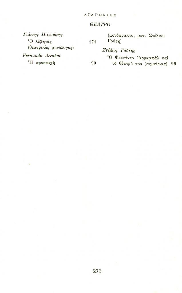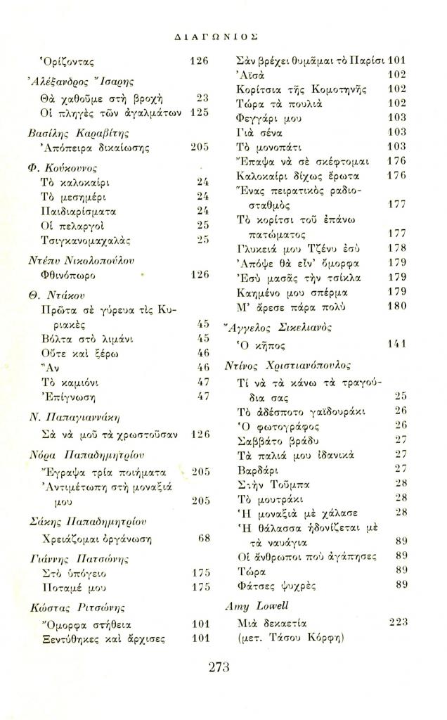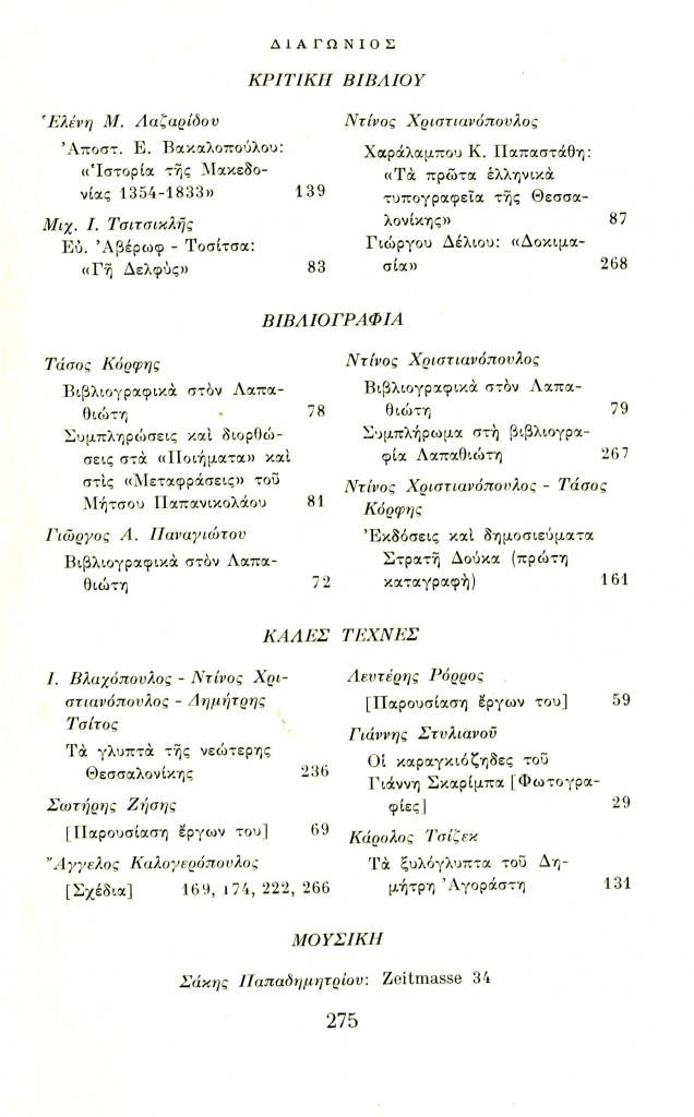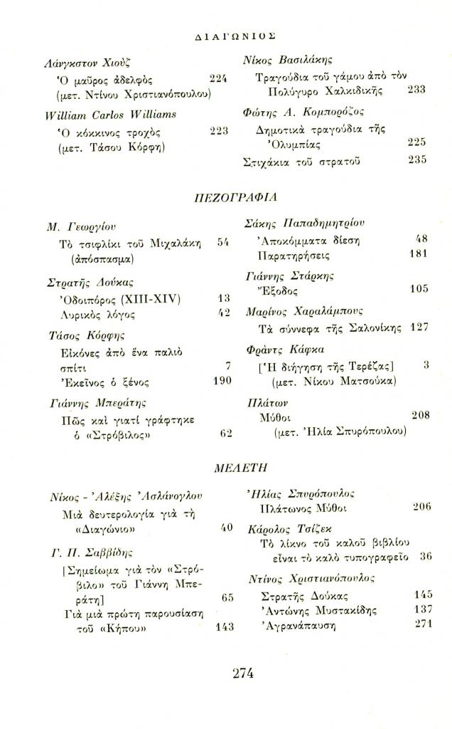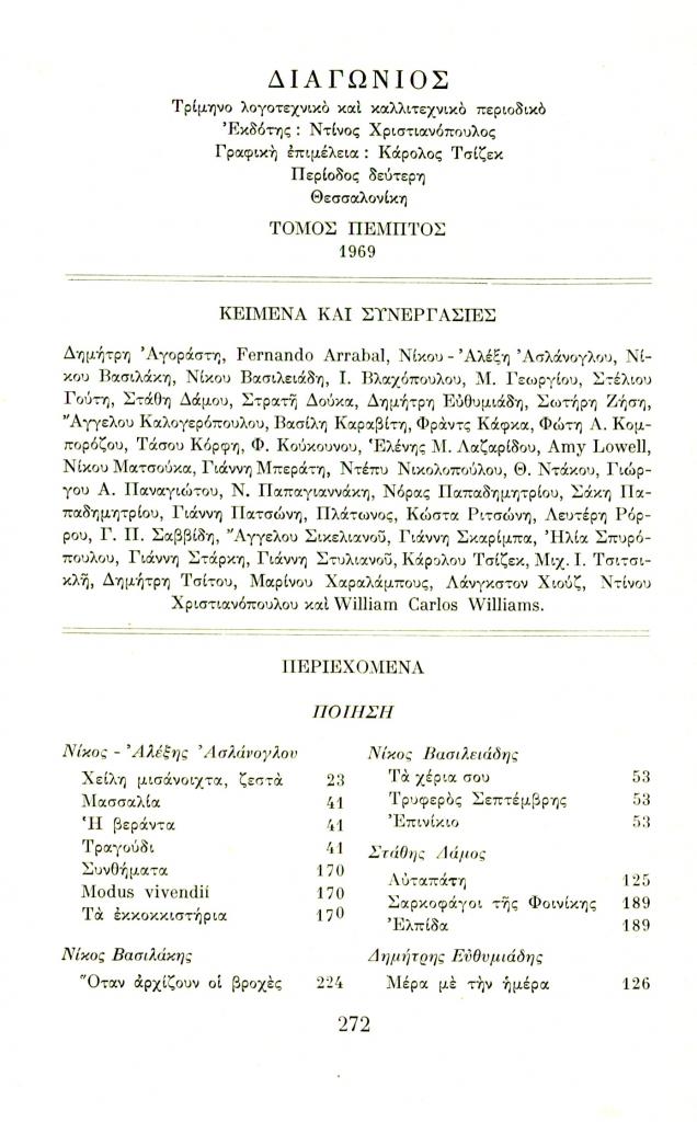 «Τόμος πέμπτος 1969-Κείμενα και συνεργασίες-Περιεχόμενα», Διαγώνιος, τχ. 20 (Οκτώβριος-Δεκέμβριος 1969), σ. 272-276
