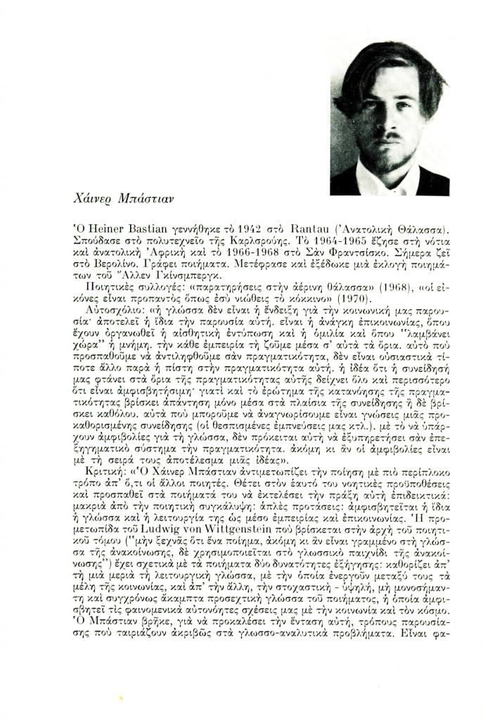(ανυπόγραφο), «[Heiner Bastian]», Διαγώνιος, τχ. 3 (Σεπτέμβριος-Δεκέμβριος 1972), σ. 262