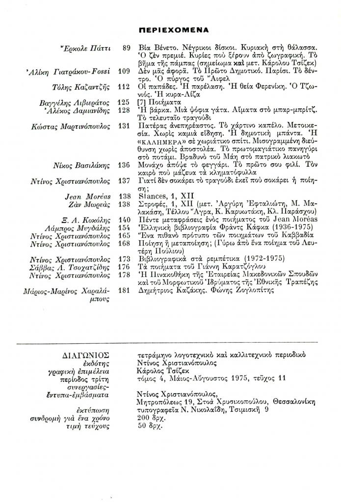 «Περιεχόμενα», Διαγώνιος, τχ. 11 (Μάιος-Αύγουστος 1975), σ. (εσώφυλλο)
