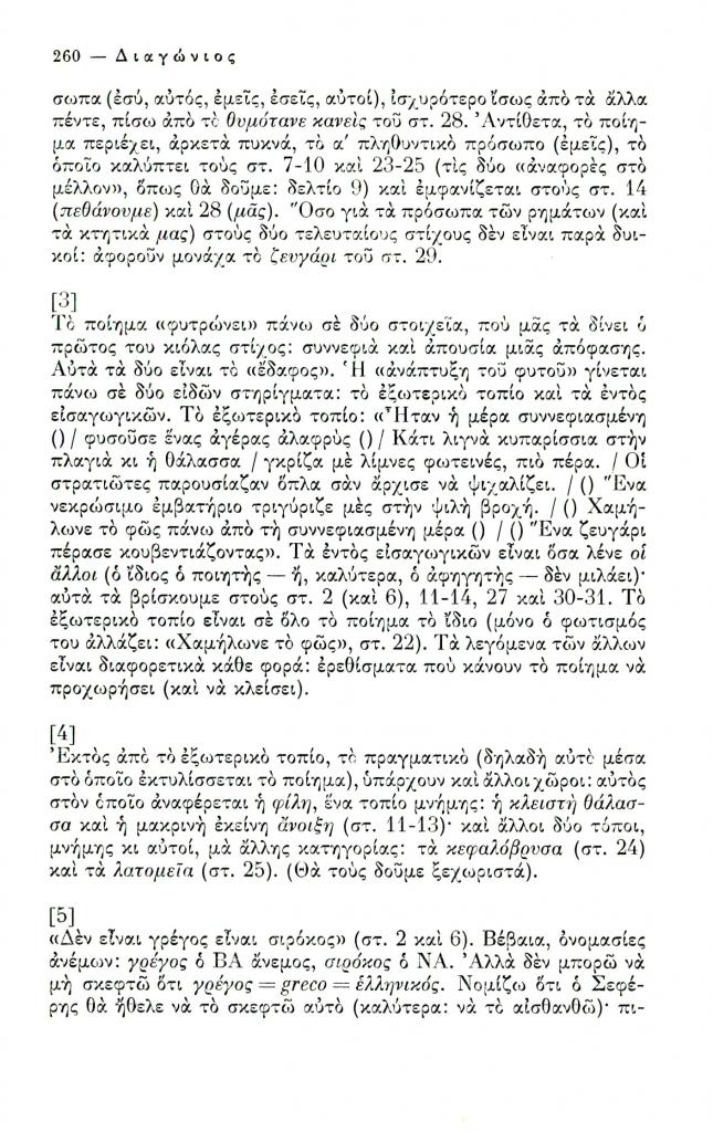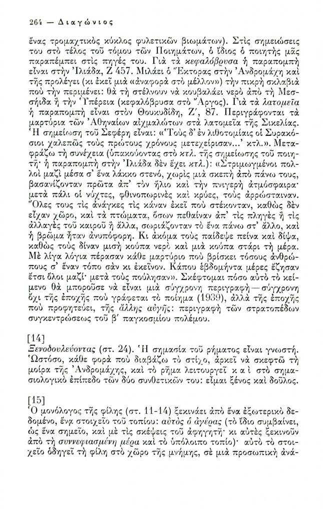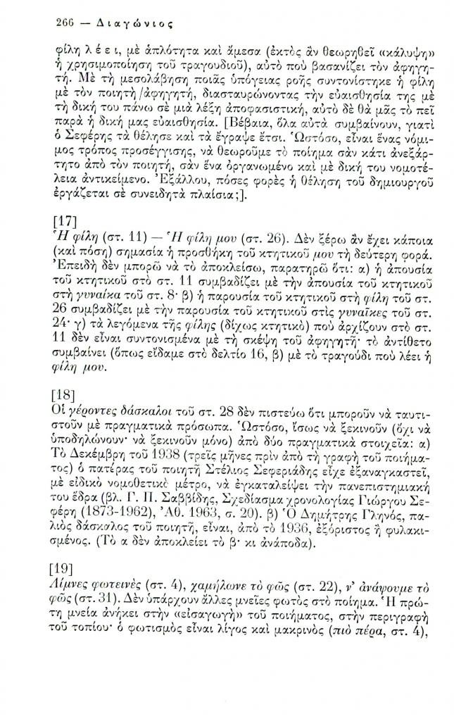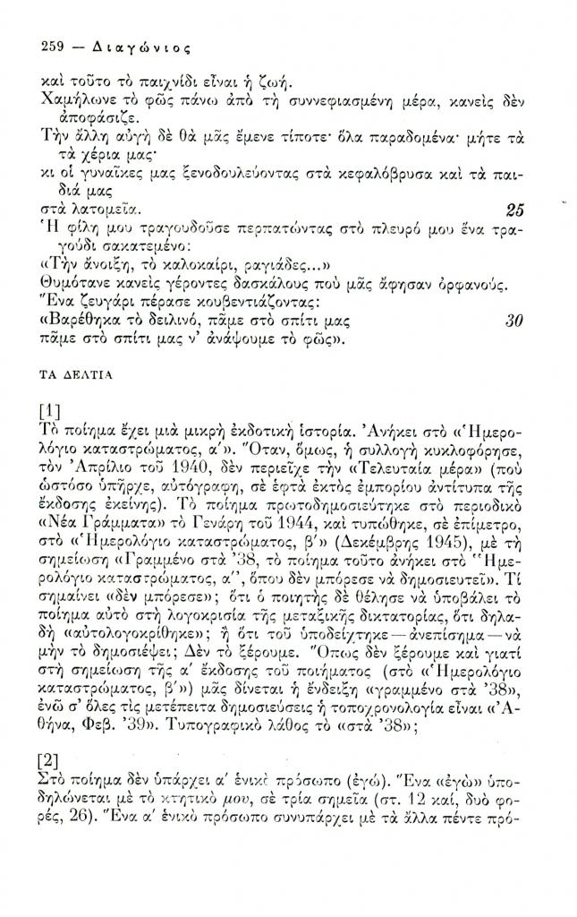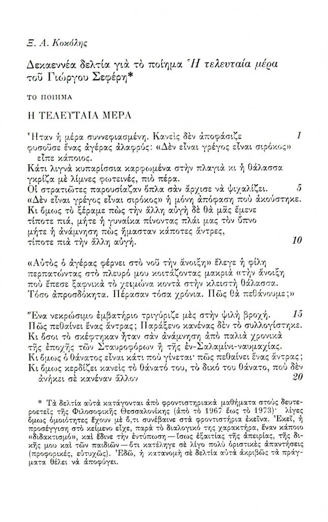 , «Δεκαεννέα δελτία για το ποίημα Η τελευταία μέρα του Γιώργου Σεφέρη», Διαγώνιος, τχ. 12 (Σεπτέμβριος-Δεκέμβριος 1975), σ. 258-267