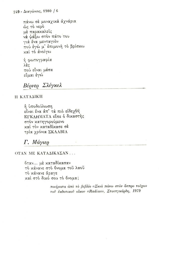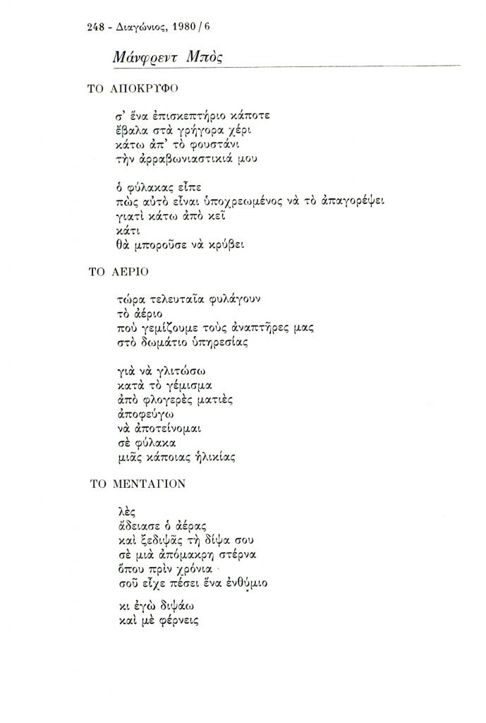 Bosch Manfred, «Το μενταγιόν», Διαγώνιος, τχ. 6 (Σεπτέμβριος-Δεκέμβριος 1980), σ. 248-249
