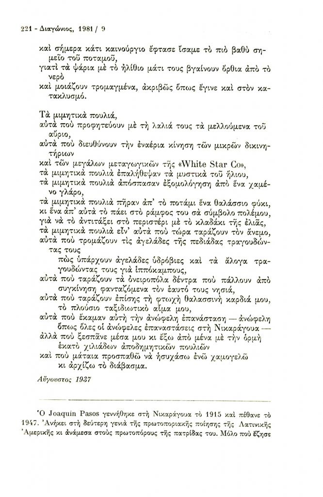 Καππάτος Ρήγας, «[Joaquín Pasos]», Διαγώνιος, τχ. 9 (Σεπτέμβριος-Δεκέμβριος 1981), σ. 221-222