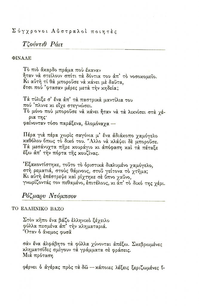 Wright Judith, «Σύγχρονοι Αυστραλοί ποιητές. Φινάλε», Διαγώνιος, τχ. 9 (Σεπτέμβριος-Δεκέμβριος 1981), σ. 223
