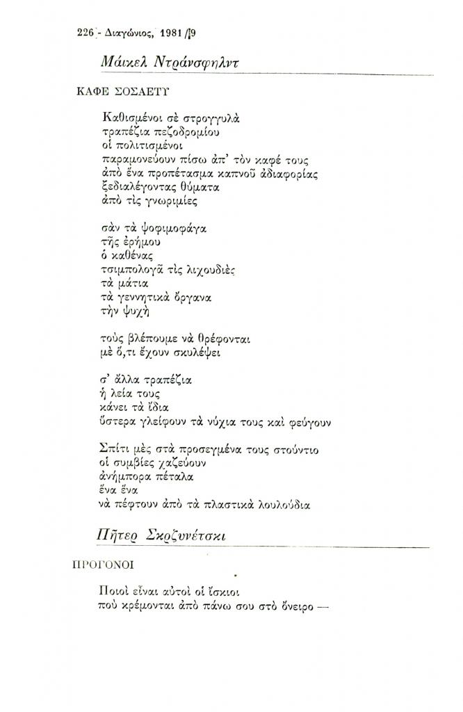 Dransfield Michael, «Σύγχρονοι Αυστραλοί ποιητές. Καφέ Σοσάετυ», Διαγώνιος, τχ. 9 (Σεπτέμβριος-Δεκέμβριος 1981), σ. 226
