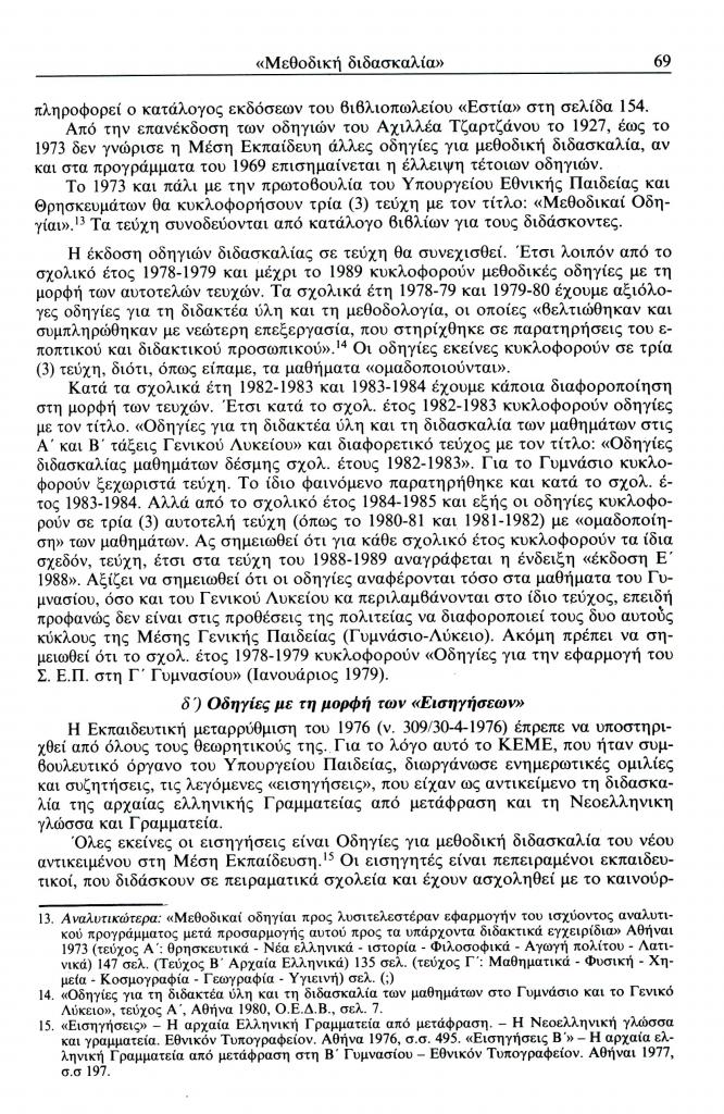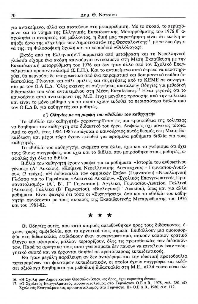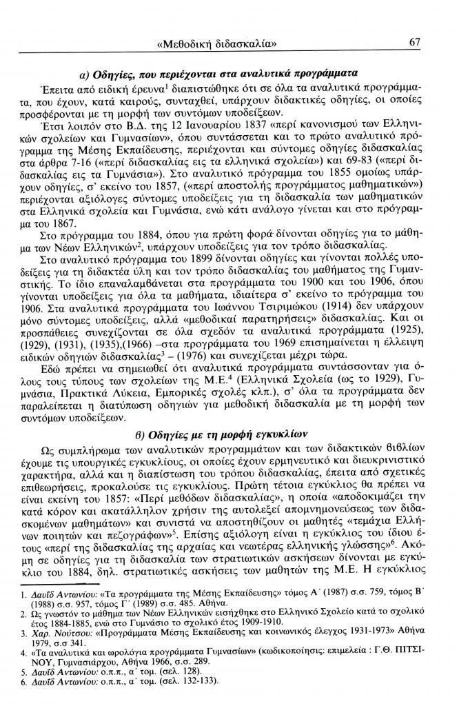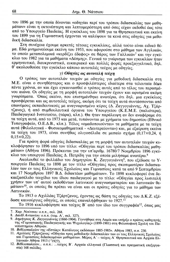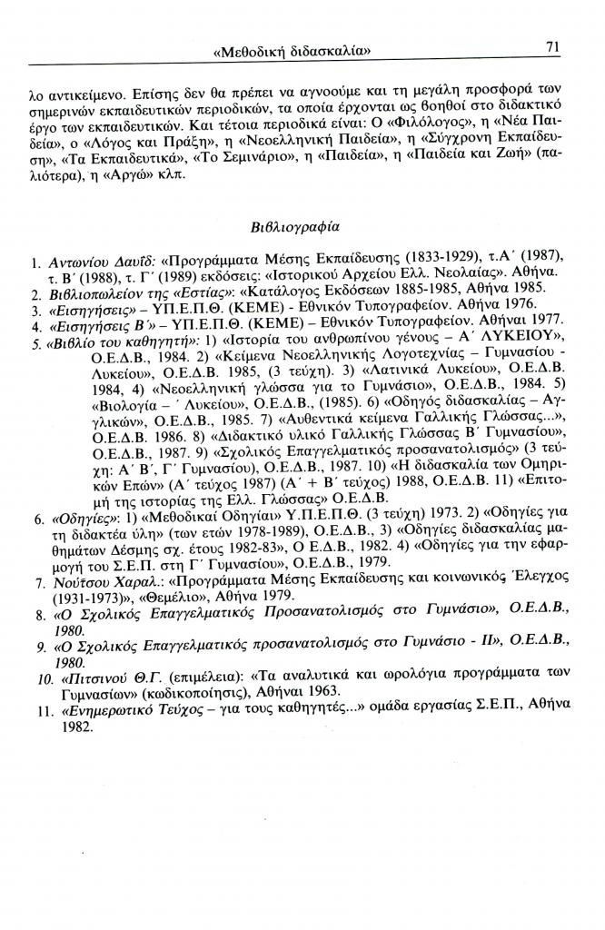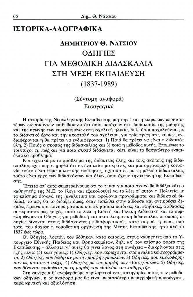 Νάτσιος Δημήτριος Θ., «Οδηγίες για μεθοδική διδασκαλία στη μέση εκπαίδευση (1837-1989) (Σύντομη αναφορά)», Έκφραση, τόμ. 1, τχ. 1 (Δεκέμβριος 1989), σ. 66-71