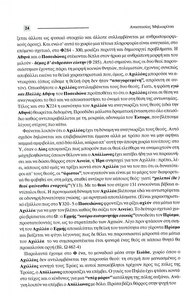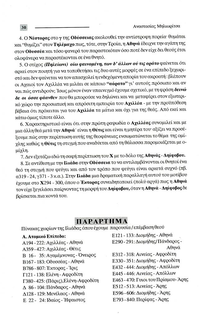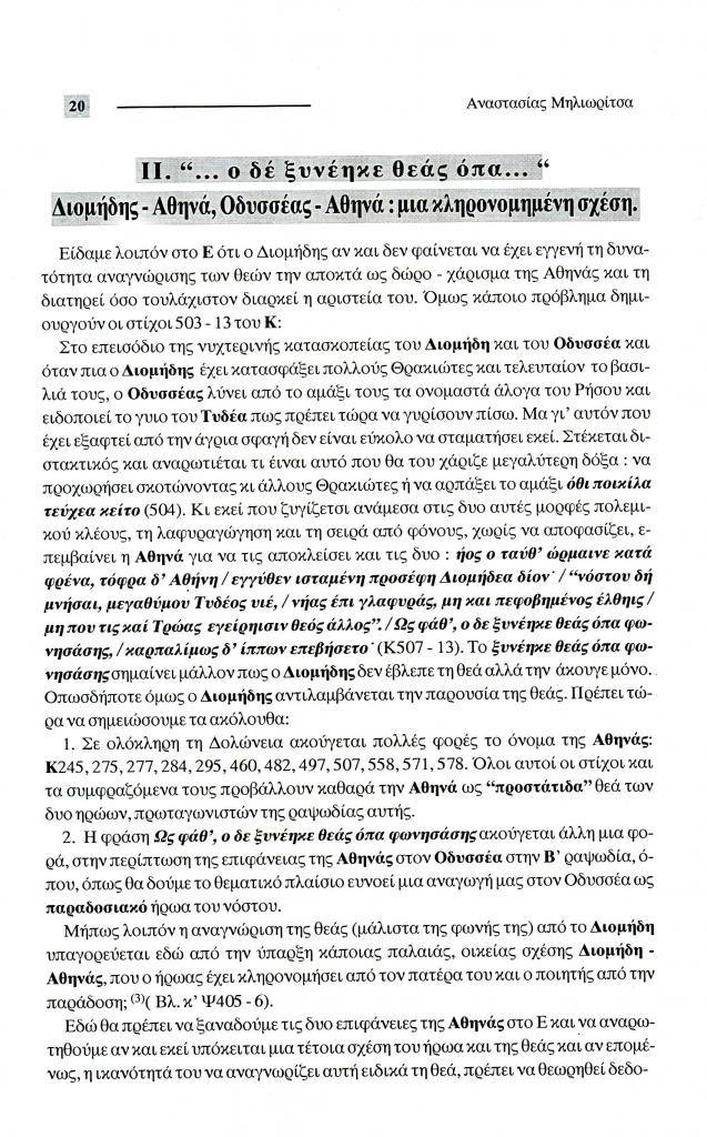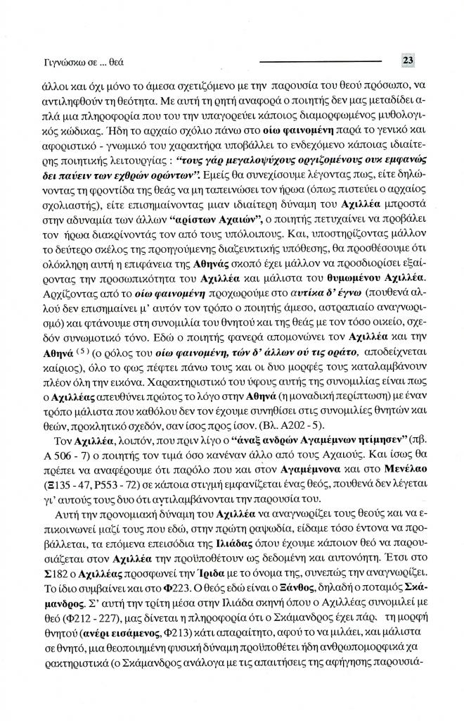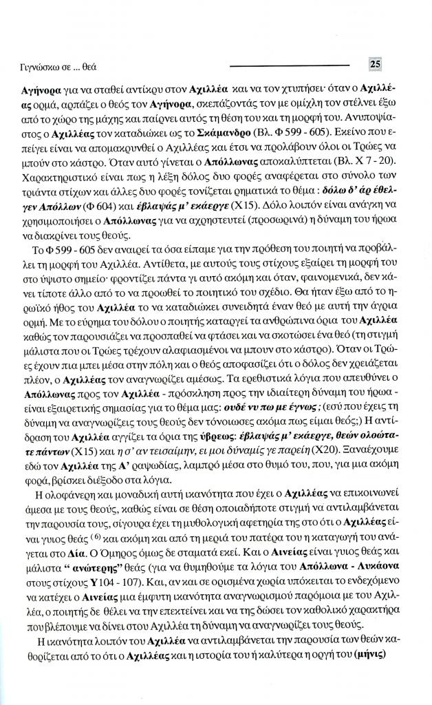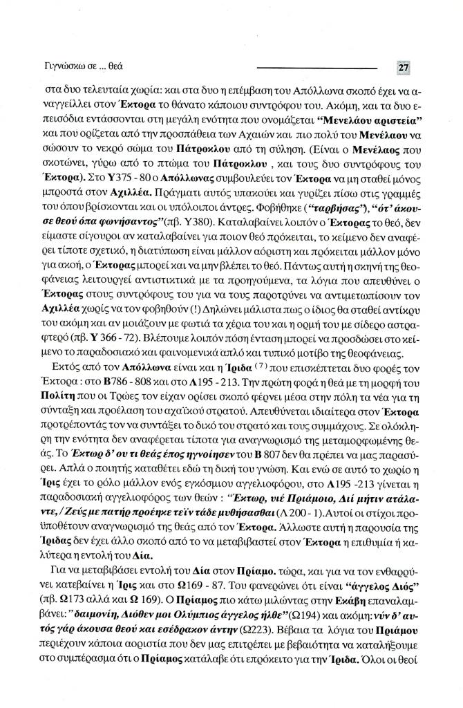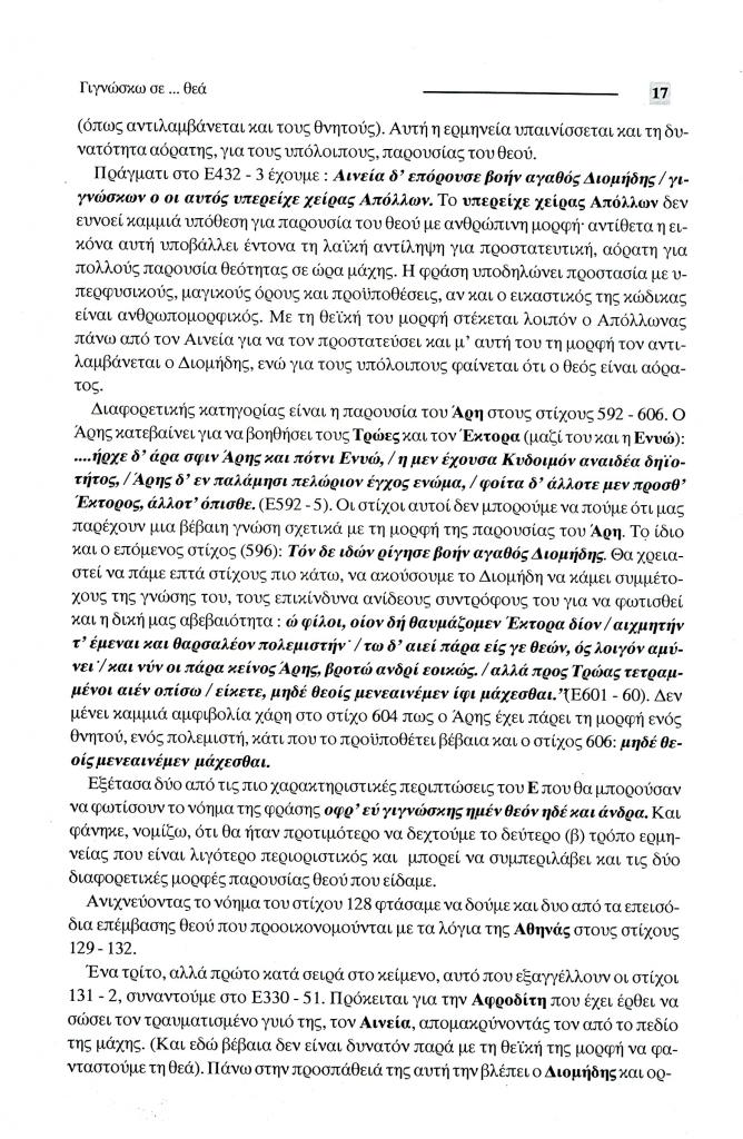 , «Γιγνώσκω σε θεά Σκηνές επιφάνειας στο ομηρικό έπος, ποιοι άνθρωποι και πότε αντιλαμβάνονται την παρουσία θεότητας στην Ιλιάδα», Έκφραση, τόμ. 8, τχ. 8 (Ιούλιος 1996), σ. 15-32