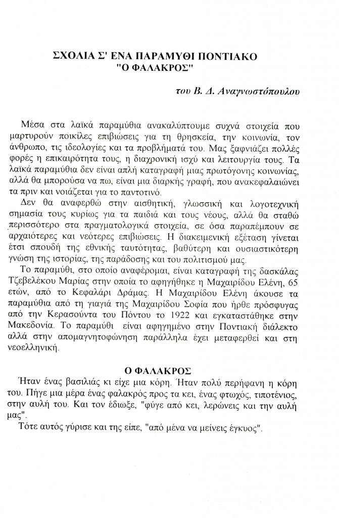 Αναγνωστόπουλος Βασίλειος Δ., «Σχόλια σ' ένα παραμύθι ποντιακό. Ο φαλακρός», Έκφραση, τόμ. 10, τχ. 10 (Οκτώβριος 1999), σ. 163-167