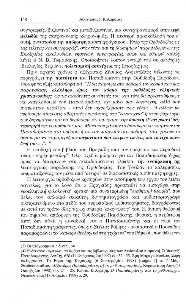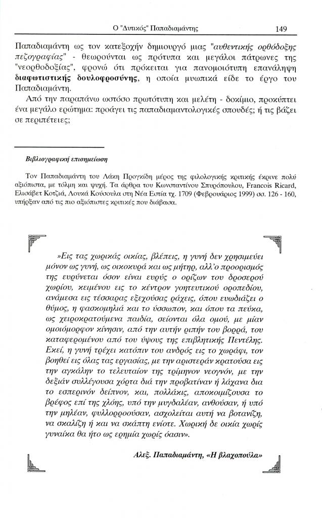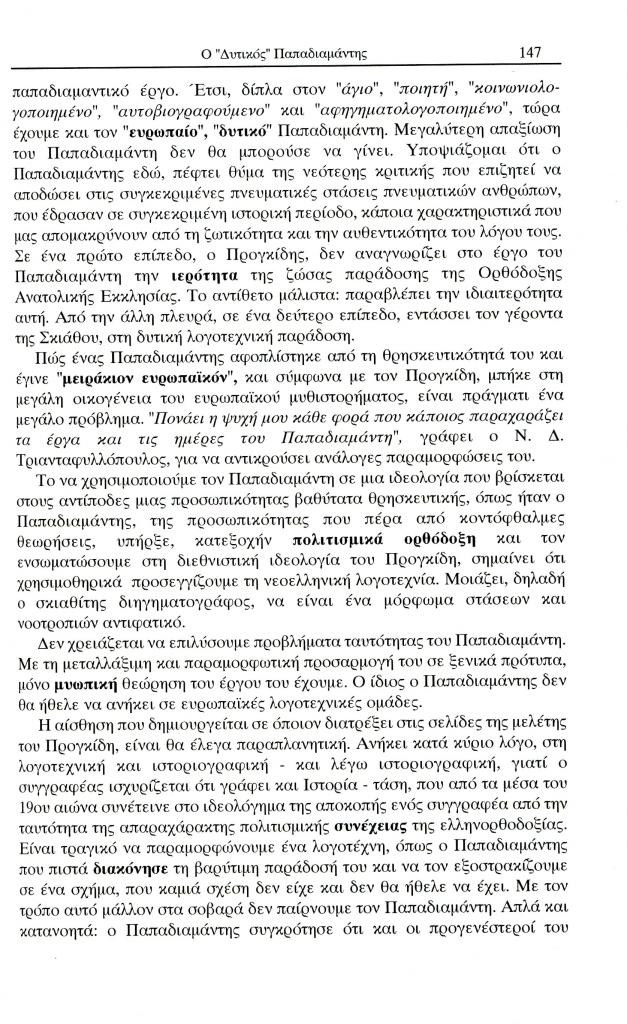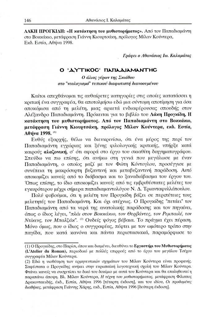 , «Ο δυτικός Παπαδιαμάντης. Ο άλιος γέρων της Σκιάθου στο νεολογισμό τυπικού διαφωτιστή διανοούμενου», Έκφραση, τόμ. 12, τχ. 12 (Σεπτέμβριος 2001), σ. 146-149