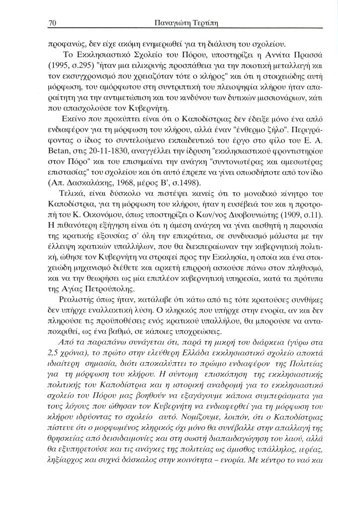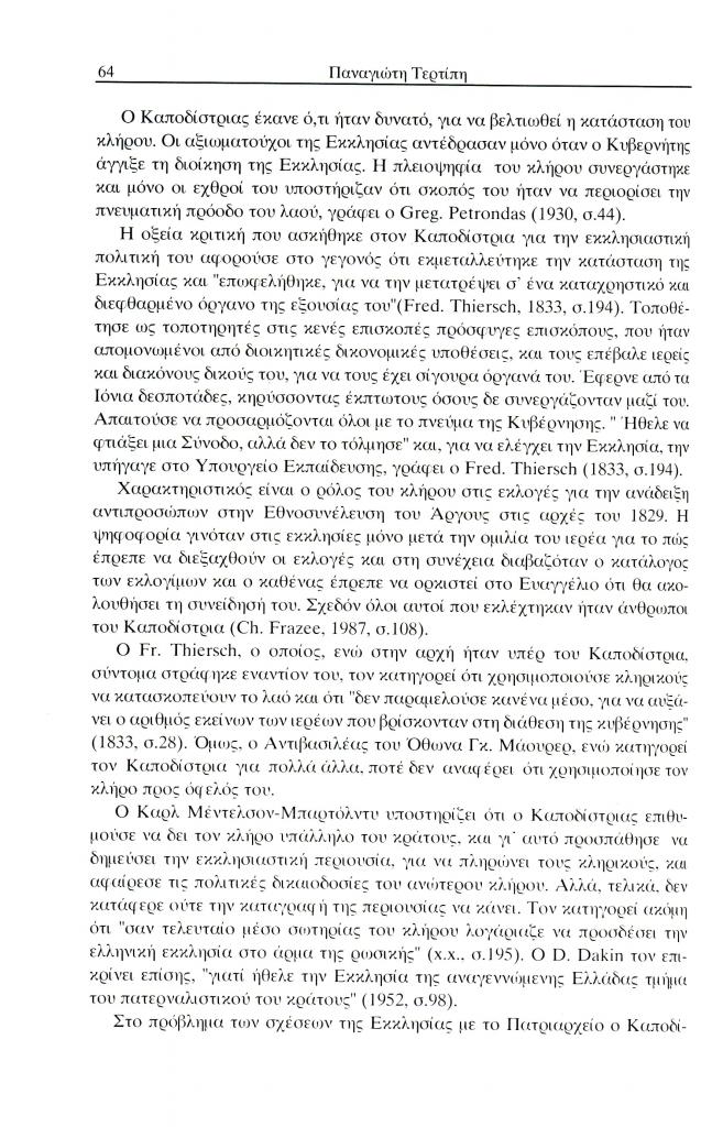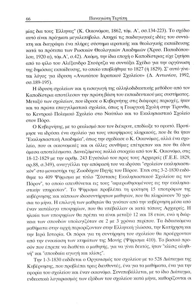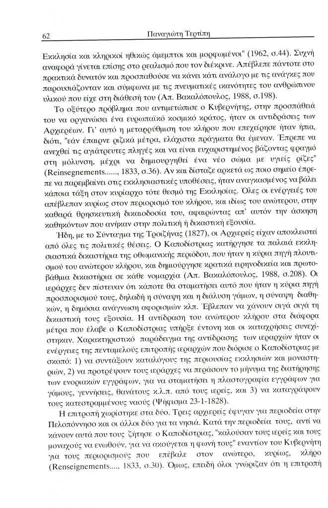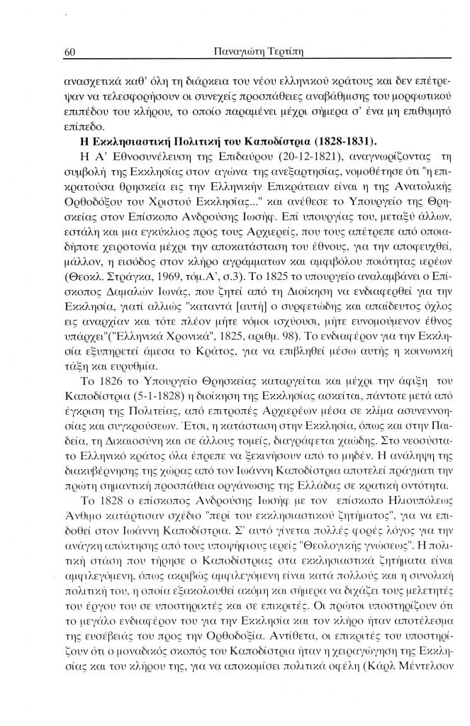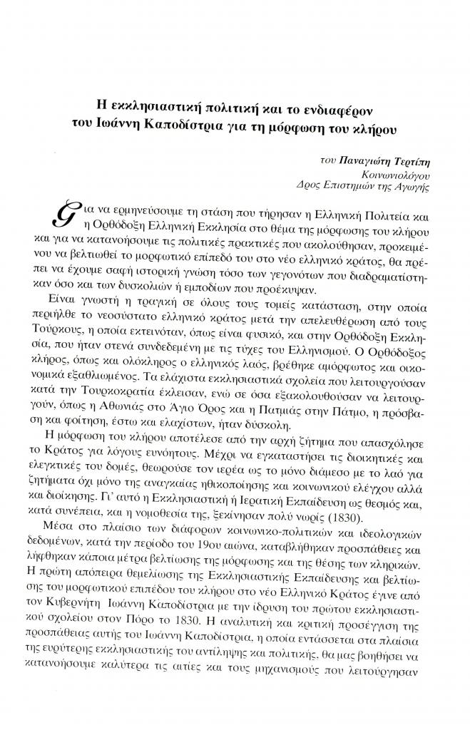Τερτίπης Παναγιώτης, «Η εκκλησιαστική πολιτική και το ενδιαφέρον του Ιωάννη Καποδίστρια για τη μόρφωση του κλήρου», Έκφραση, τόμ. 13, τχ. 13 (Δεκέμβριος 2002), σ. 59-72