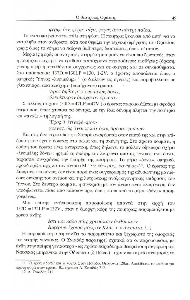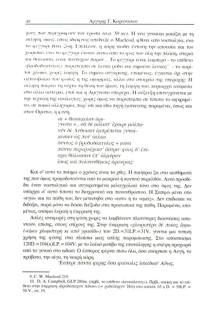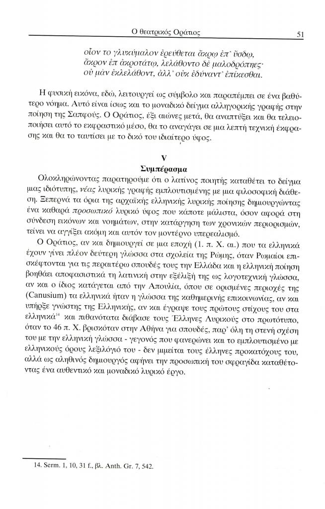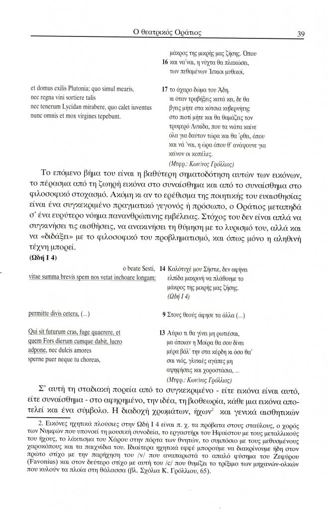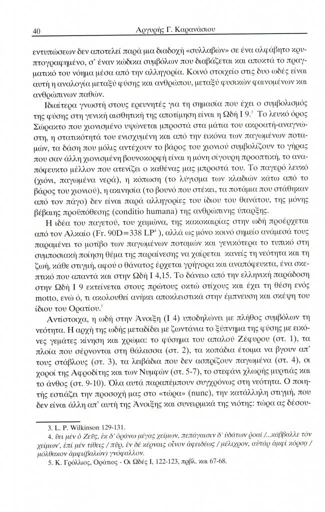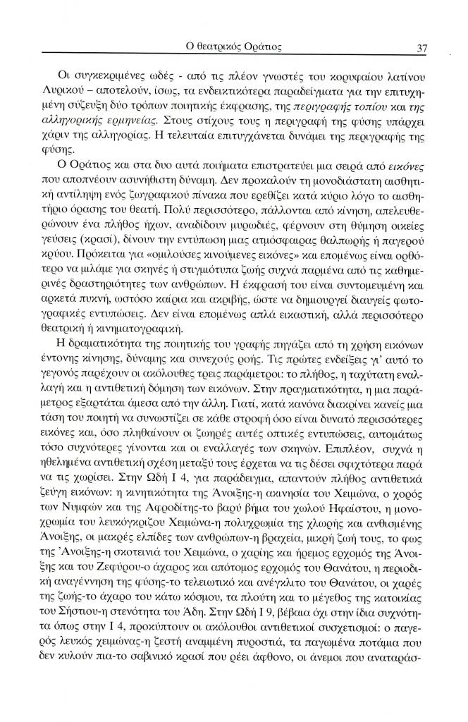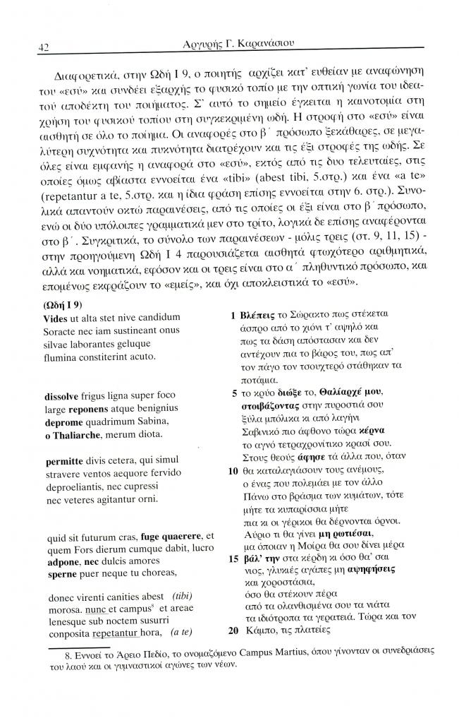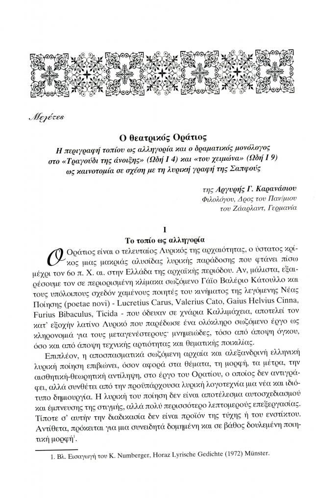 , «Ο θεατρικός Οράτιος. Η περιγραφή τοπίου ως αλληγορία και ο δραματικός μονόλογος στο Τραγούδι της άνοιξης (Ωδή I 4) και του χειμώνα (Ωδή Ι 9) ως καινοτομία σε σχέση με τη λυρική γραφή της Σαπφούς», Έκφραση, τόμ. 14-15, τχ. 14-15 ( 2004), σ. 36-52