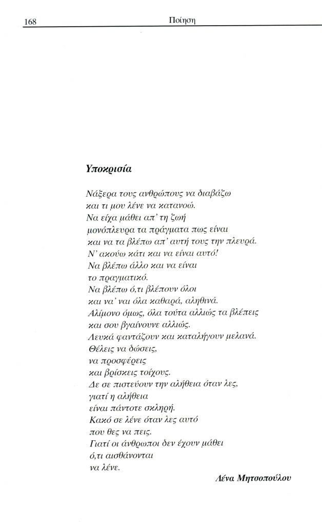 Μητσοπούλου Λένα, «Υποκρισία», Έκφραση, τόμ. 14-15, τχ. 14-15 ( 2004), σ. 168