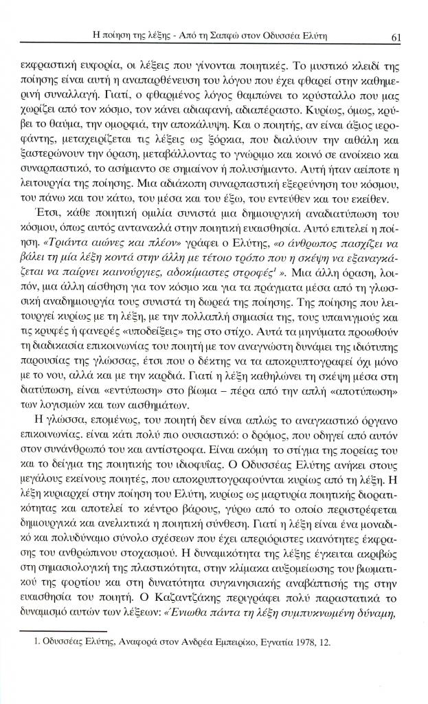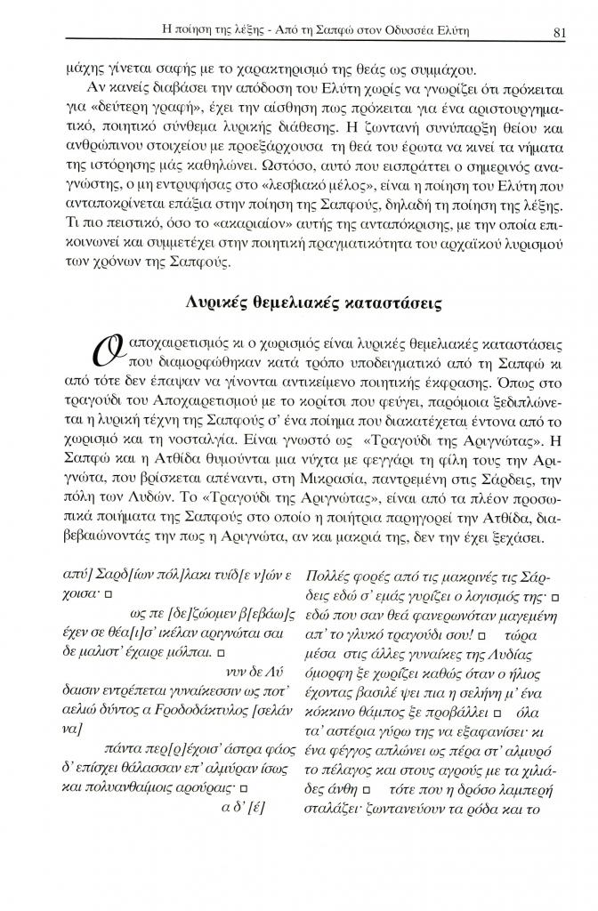 , «Η ποίηση της λέξης. Από τη Σαπφώ στον Οδυσσέα Ελύτη»,