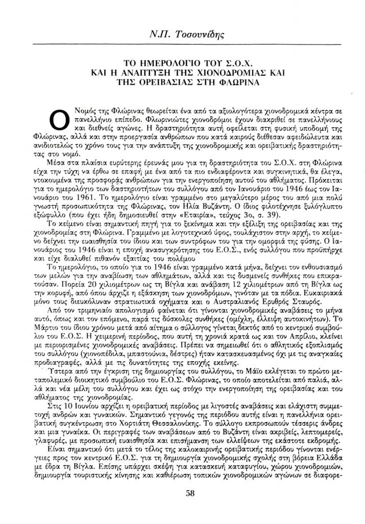 Τοσουνίδης Ν.Π., «Το ημερολόγιο του Σ.Ο.Χ. και η ανάπτυξη της χιονοδρομίας και της ορειβασίας στη Φλώρινα», Εταιρία, τχ. 10 (Μάιος 1992), σ. 58-61