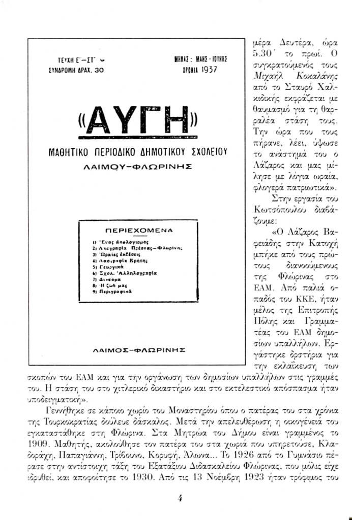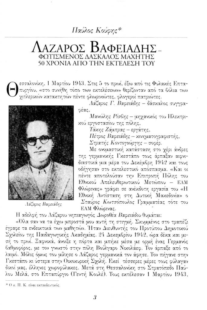 , «Λάζαρος Βαφειάδης. Φωτισμένος δάσκαλος μαχητής 50 χρόνια από την εκτέλεσή του», Εταιρία, τχ. 14 (Νοέμβριος 1993), σ. 3-10