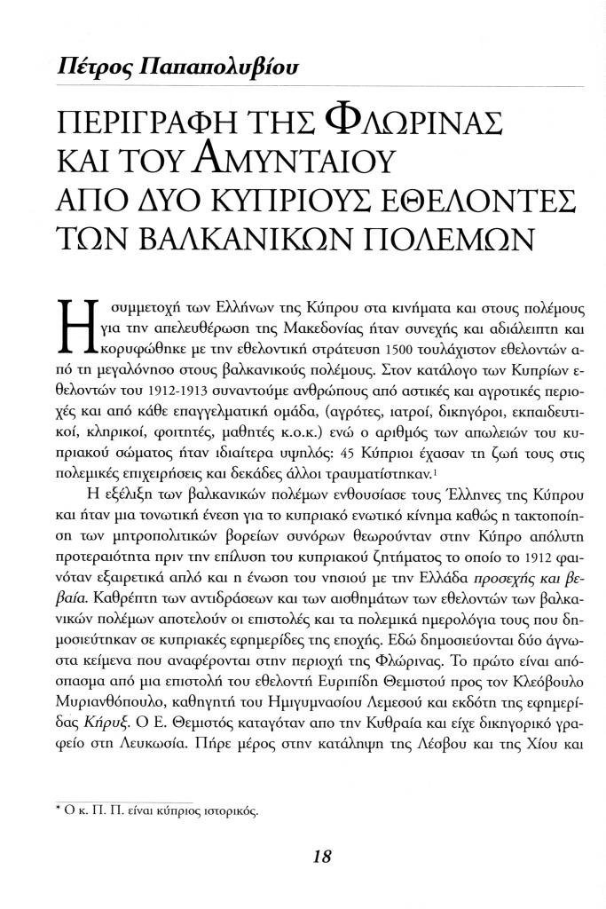 , «Περιγραφή της Φλώρινας και του Αμυνταίου από δύο Κύπριους εθελοντές των Βαλκανικών », Εταιρία, τχ. 22 (Δεκέμβριος 1995), σ. 18-23