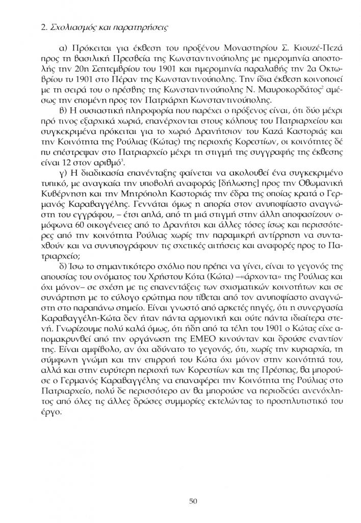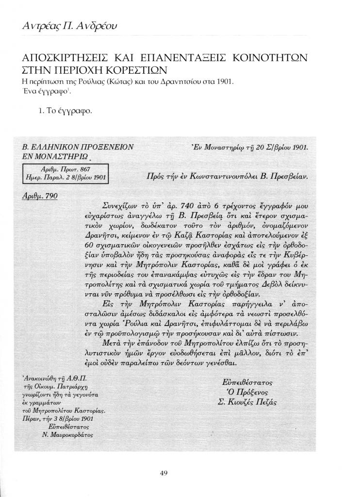 , «Αποσκιρτήσεις και επανεντάξεις κοινοτήτων στην περιοχή Κορεστίων. Η περίπτωση της Ρούλιας (Κώτας) και του Δρανητσίου στα 1901», Εταιρία, τχ. 30 (Απρίλιος 1998), σ. 49-51